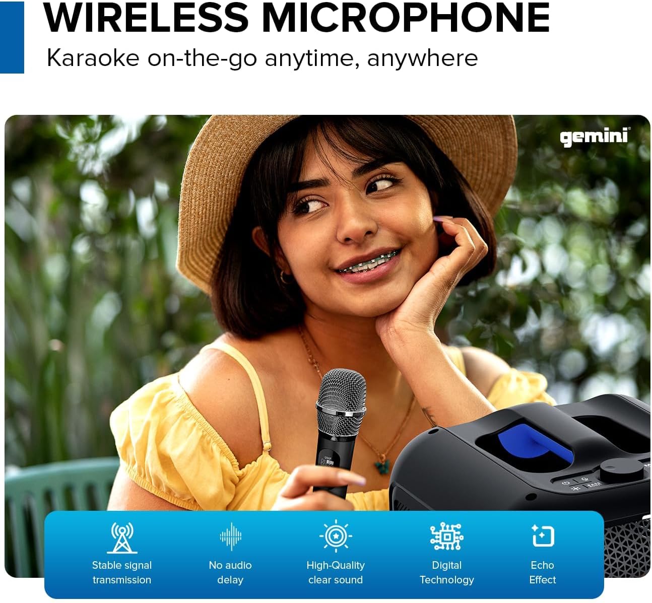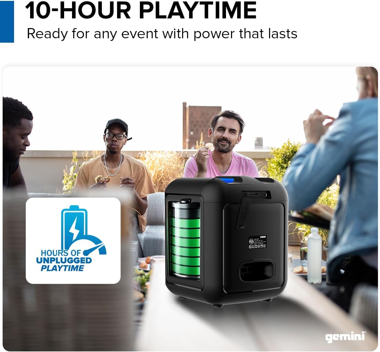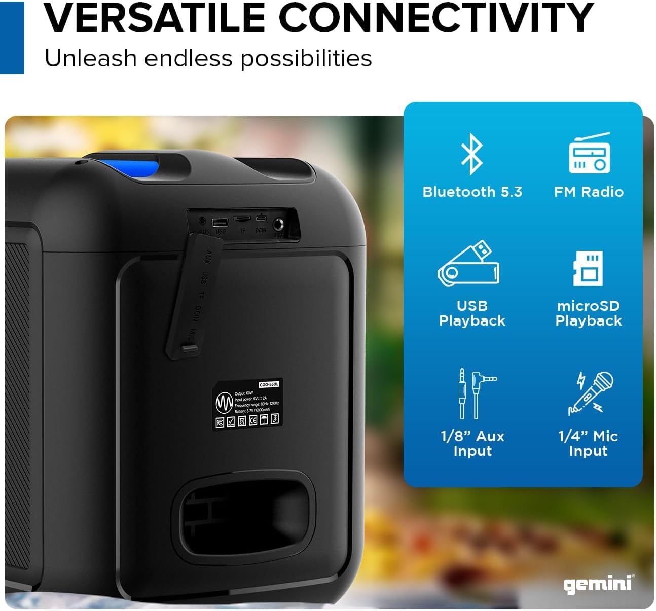 Gemini Box-Style Bluetooth Party Speaker with LED Lights, 6.5” Woofer, Wireless Mic, Deep Bass, TWS Stereo Pairing, USB/SD/FM/Aux, 10-Hour Battery Play Time, 100W Loud Sound for Home & Karaoke