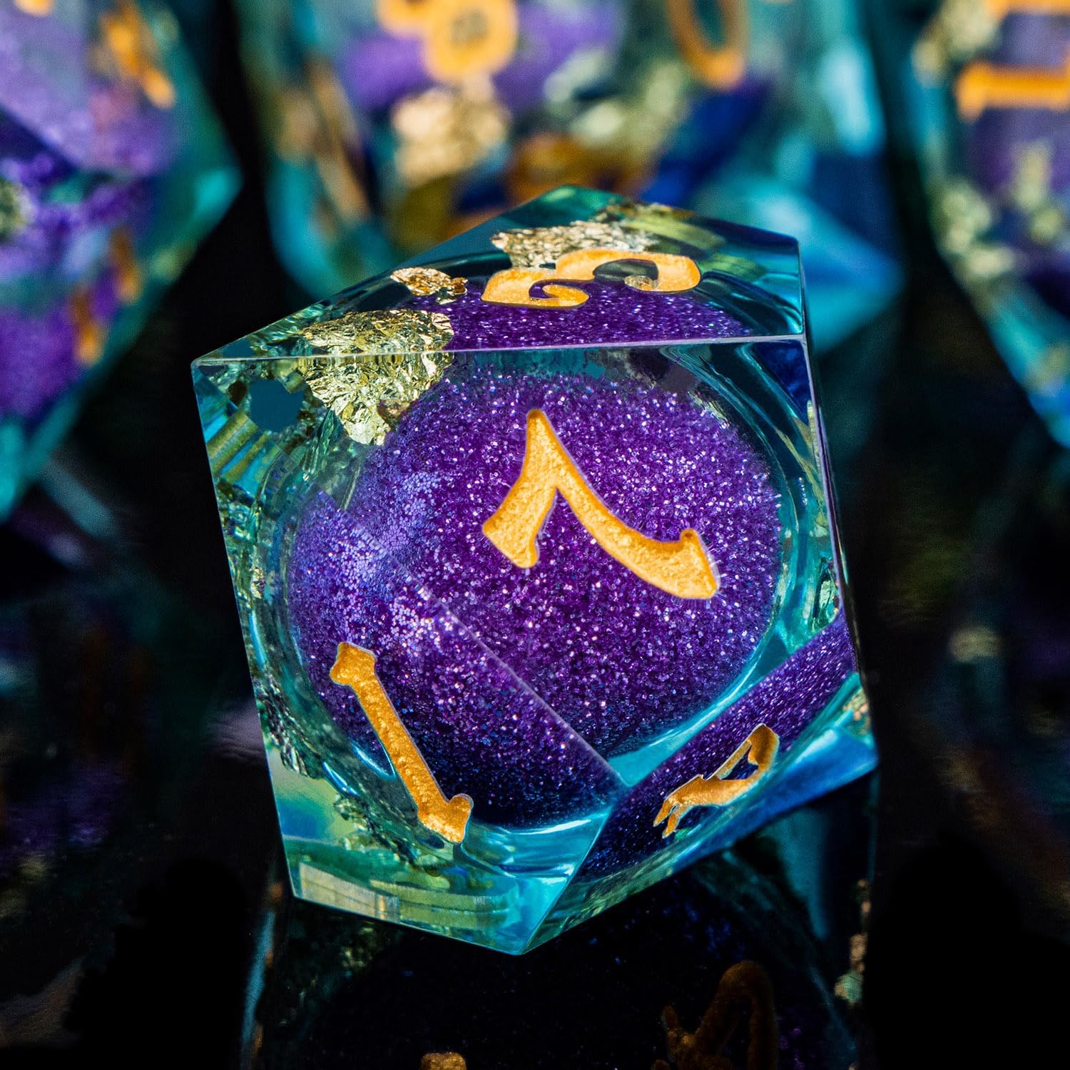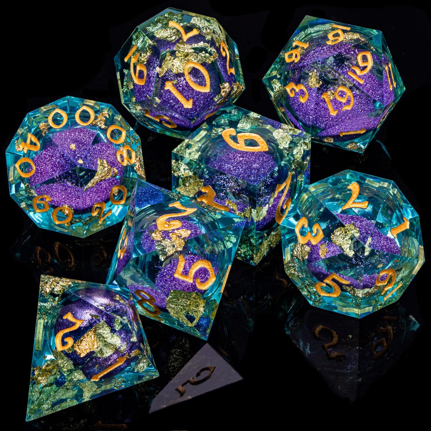 ARUOHHA Liquid Core DND Dice Set, 7pcs Resin Sharp Edged Dragons Dice RPG Role Playing Games, Purple Blue Polyhedral Dungeons D and D Dice with Gift Box D20 D12 D10 D8 D6 D4