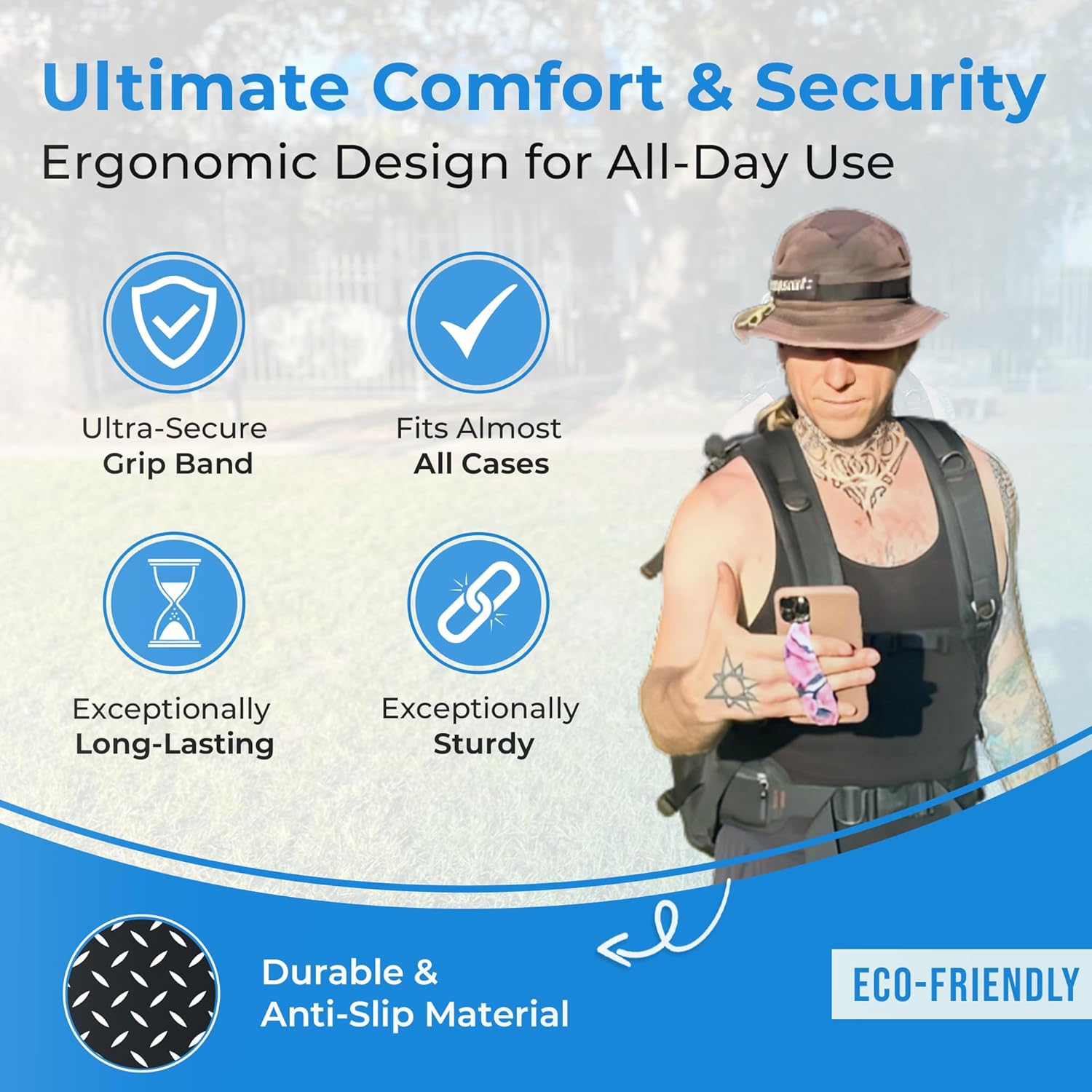 - Ergonomic, Sweat-Resistant Comfort – Featuring an anatomically designed phone finger holder with advanced sweat-resistant padding, this phone strap provides all-day comfort and a slip-proof grip, even during intense use. Whether you’re texting, gaming, or browsing one-handed, the cushioned phone finger grip molds to your finger for fatigue-free handling, while the anti-slip texture ensures a firm hold in any condition—rain, sweat, or humidity. Perfect as a phone holder for hand during active use