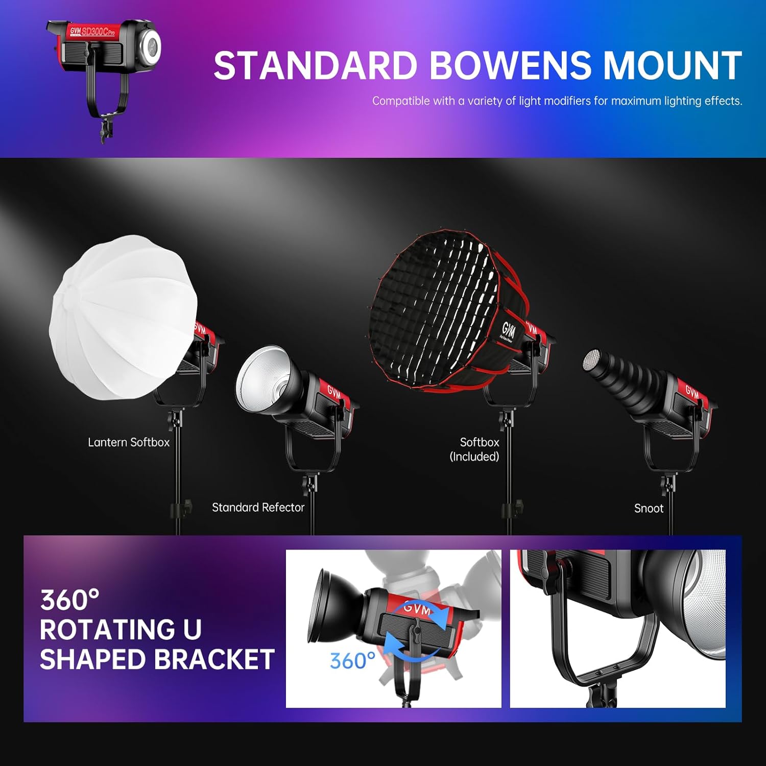 GVM 300W Photo Lighting RGB Video Light with Bowens Holder Lantern Softbox and Stand CRI 97+ CCT 2000K~10000K 6 Lighting Scenarios Application Program Controlled Studio Photo Lights