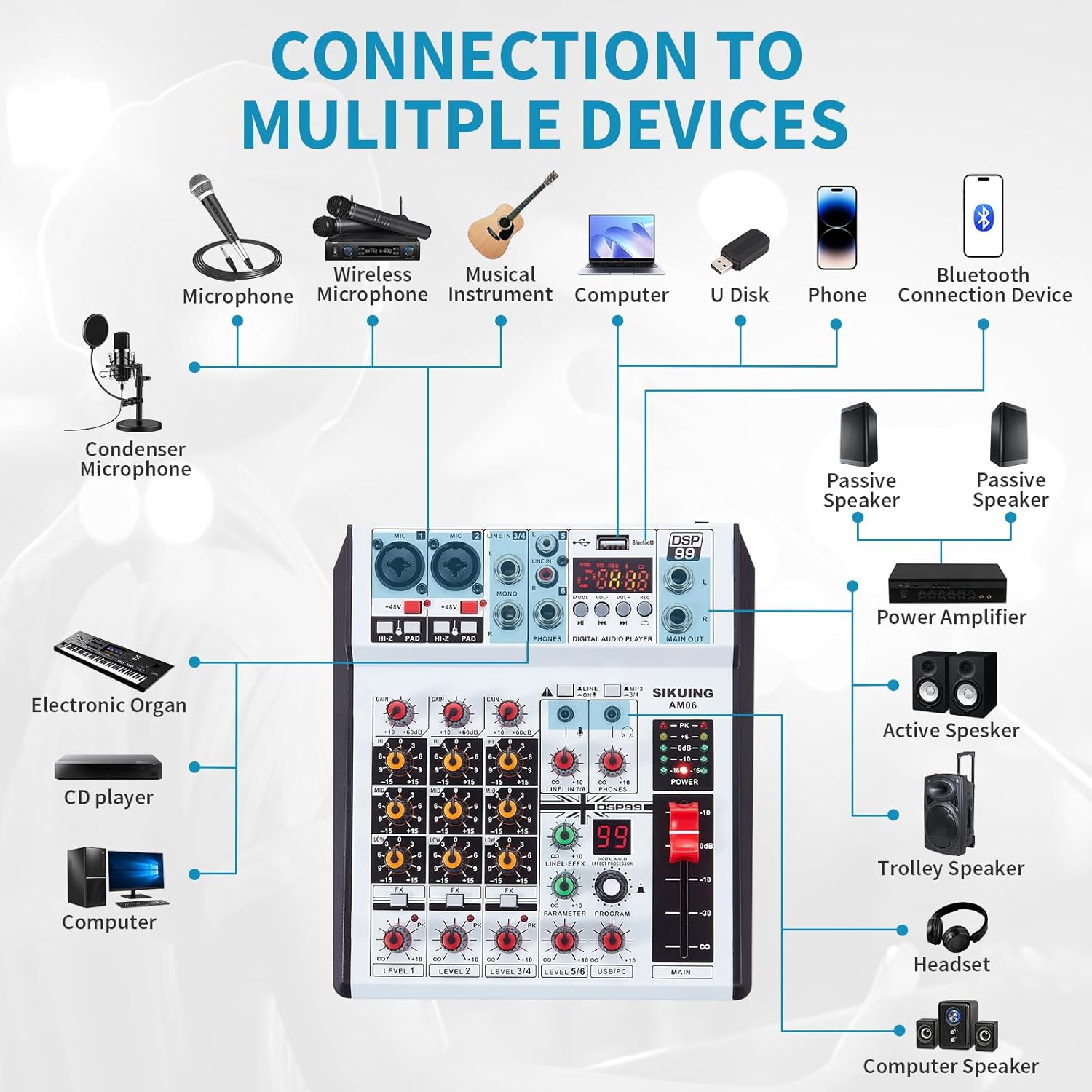 - 【THREE-BAND EQUALIZER WITH 99 DSP EFFECTS】: Rugged metal construction ensures durability and white design creates an elegant look.Easily adjust the high, mid, and low frequencies of each channel with onboard 3-band EQ and gain controls. The built-in soundboard effects processor offers 99 DSP effects for better personal mixing, and you can even add delay or reverb effects to your mix.