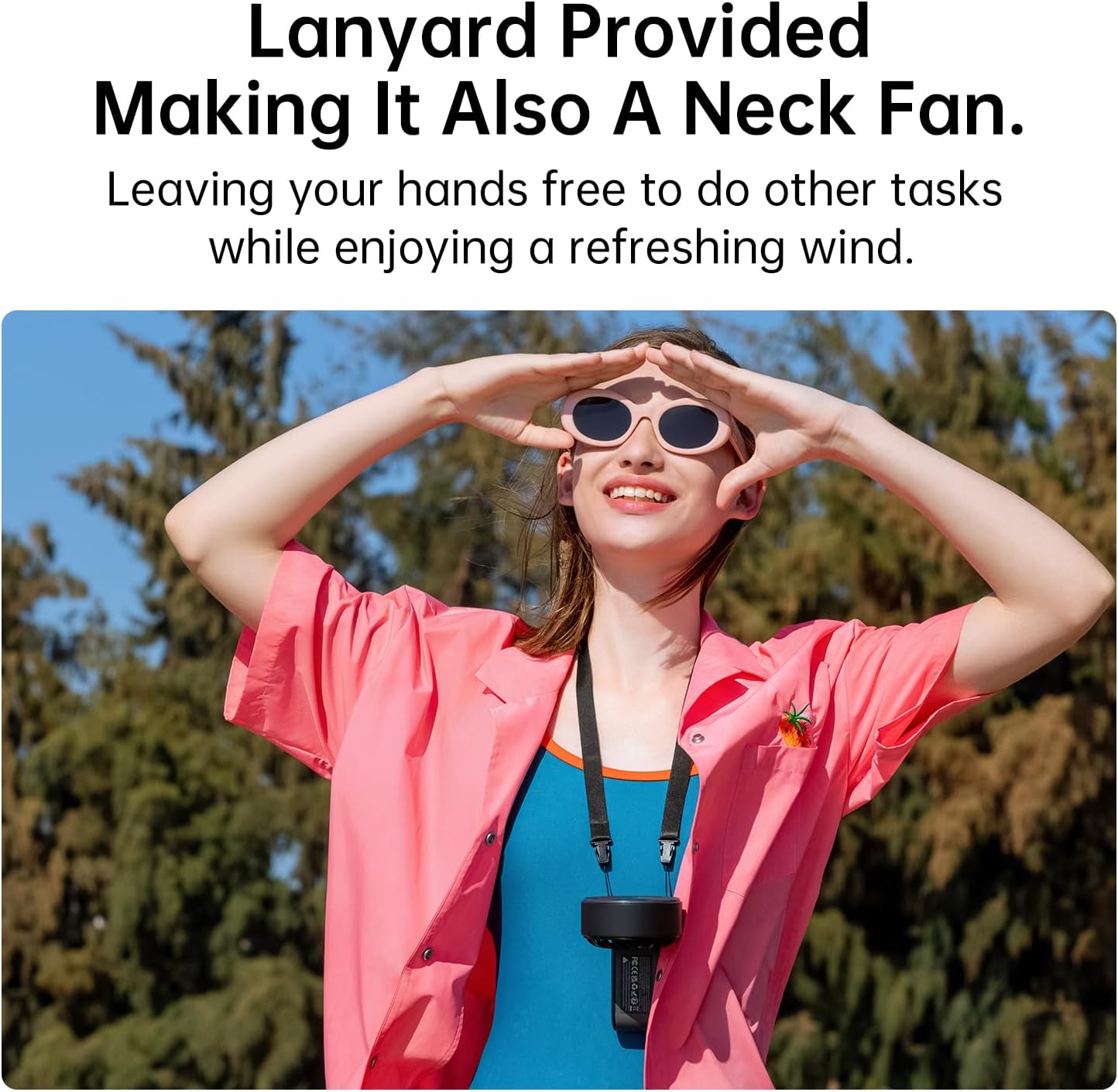 - 3-IN-1 Solution: Hang it around your neck for hands-free cooling or use it on your desk for a focused breeze; Its innovative design allows for handheld use, desktop placement, or worn around the neck, providing a 3-IN-1 solution for beating the heat