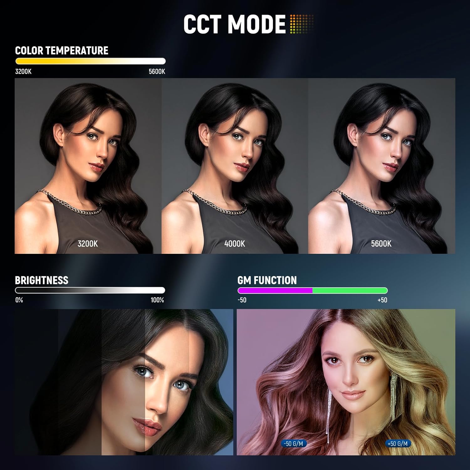 - 【Bi Color Light with GM Correction】 In CCT Mode, you can get 3200K-5600K variable color temperature and 0-100% flicker free dimming for makeup, Zoom calls, or macro photography. The GM (green/magenta) function assists with color correction and enables you to get the accurate color temperature with ease. 150 SMD LEDs deliver soft, stable lighting and a high 98+ CRI brings accurate color reproduction. Use the honeycomb grid for a focused and directional output