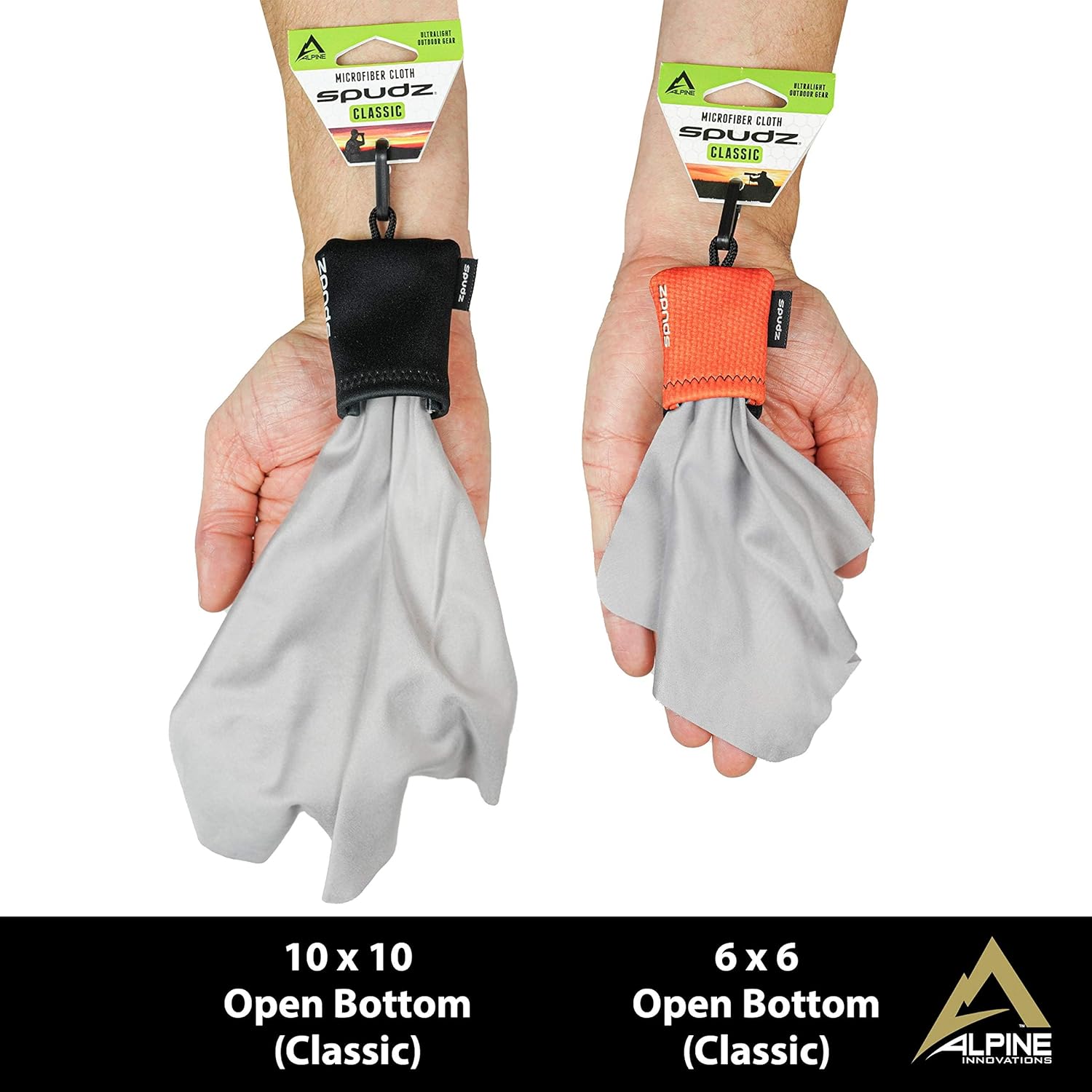 - Closed Bottom Design: Spudz Ultra is a premium microfiber lens cloth that is attached to a .5 mm neoprene pouch that flips close at the bottom. This is designed to keep the cloth protected inside. Ultra is made for the outdoors and is offered in 2 sizes; Medium, with a 6" x 6" cloth, and Large, with a 10" x 10" premium microfiber cloth and a variety of patterns.