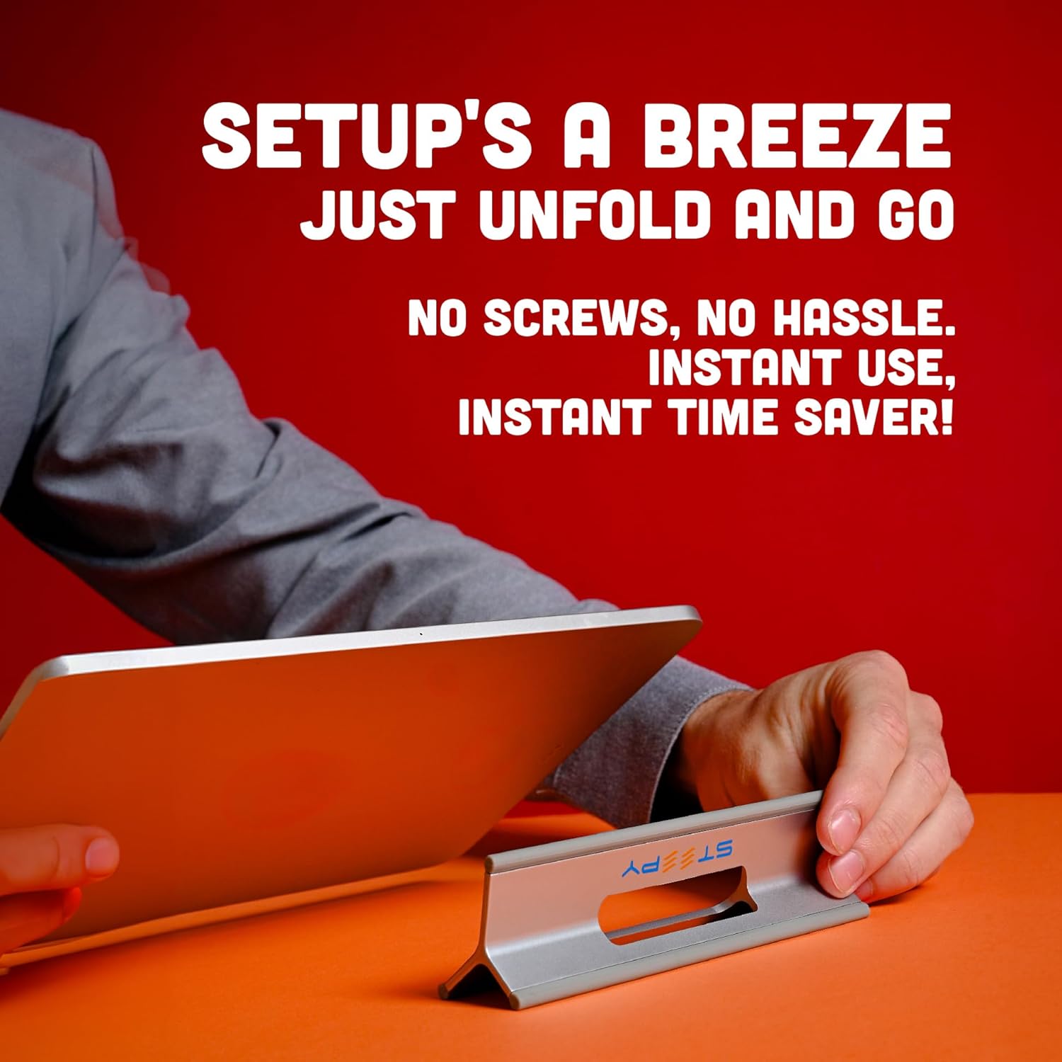 - SETUP'S A BREEZE - Just unfold & go—no screws, no hassle. Instant use, instant time saver! Steepy desk laptop stand is a laptop stand portable made out of strong & durable recycled plastic, with rubber edges to provide the sturdy & stable support your device needs & prevent it from sliding or skidding.