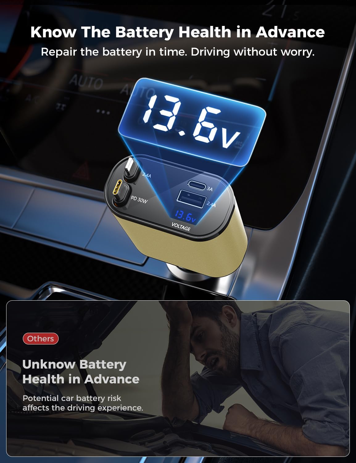 - Voltage Display for Battery Health Monitoring: Our Car Charger with cord is equipped with a voltage display feature, allowing you to monitor the health of your car battery at all times. Stay informed and ensure optimal performance for your vehicle.