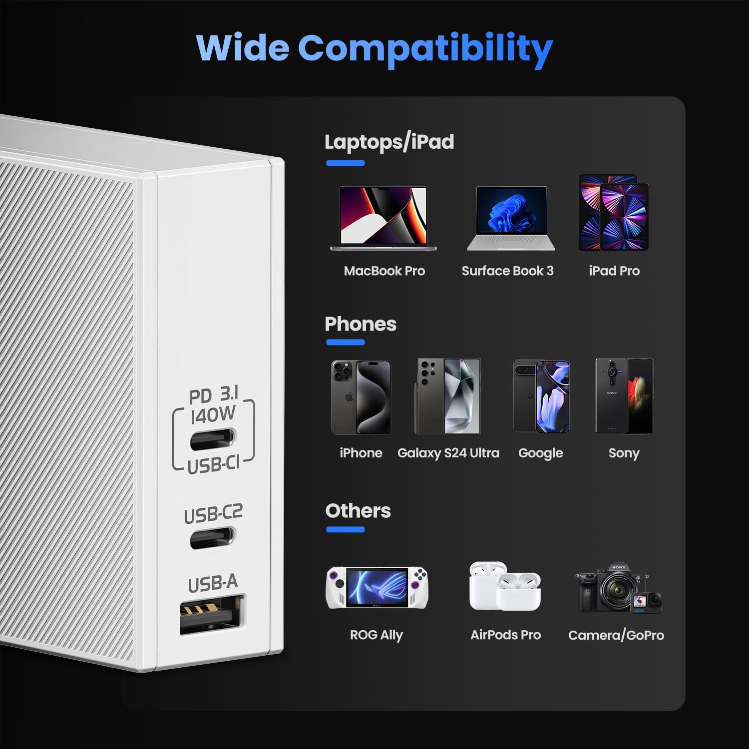 USB C Charger for Laptops 140W GaN Fast Charger with USB C and USB A, PD3.1 Power Adapter Compatible for MacBook Chromebook Surface iPhone 16/15 iPad PC Tablets (Cable Not Included)