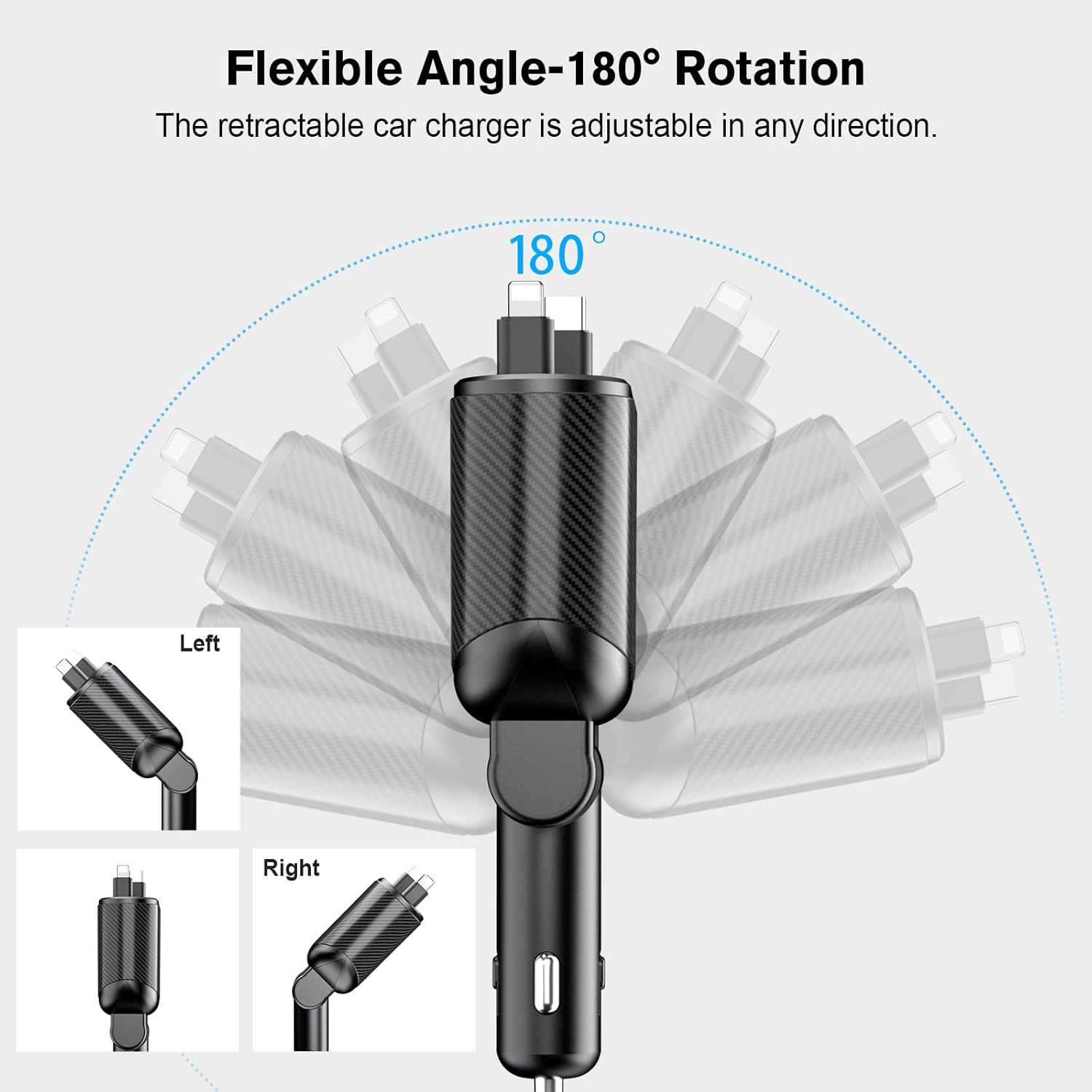 - 【180°Flexible Angle】The newly designed retractable car charger get flexible charging angles with the 180° bend-over feature that allows you to charge your devices from any angle.