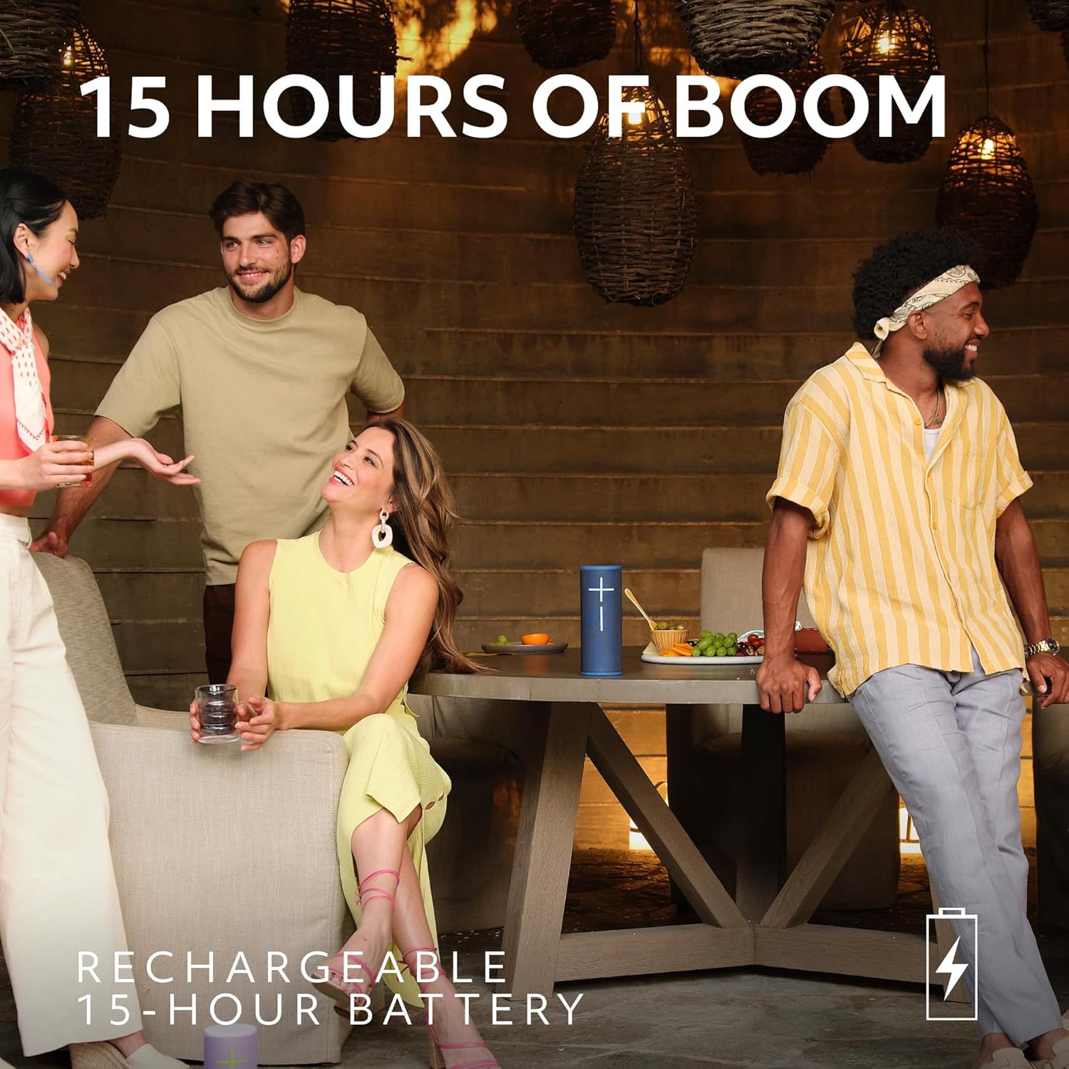 - Party Up: Use PartyUp on the Ultimate Ears Boom app to pair several BOOM, MEGABOOM, EVERBOOM, EPICBOOM, and HYPERBOOM portable Bluetooth speakers to create a surround sound experience with outdoor speakers
