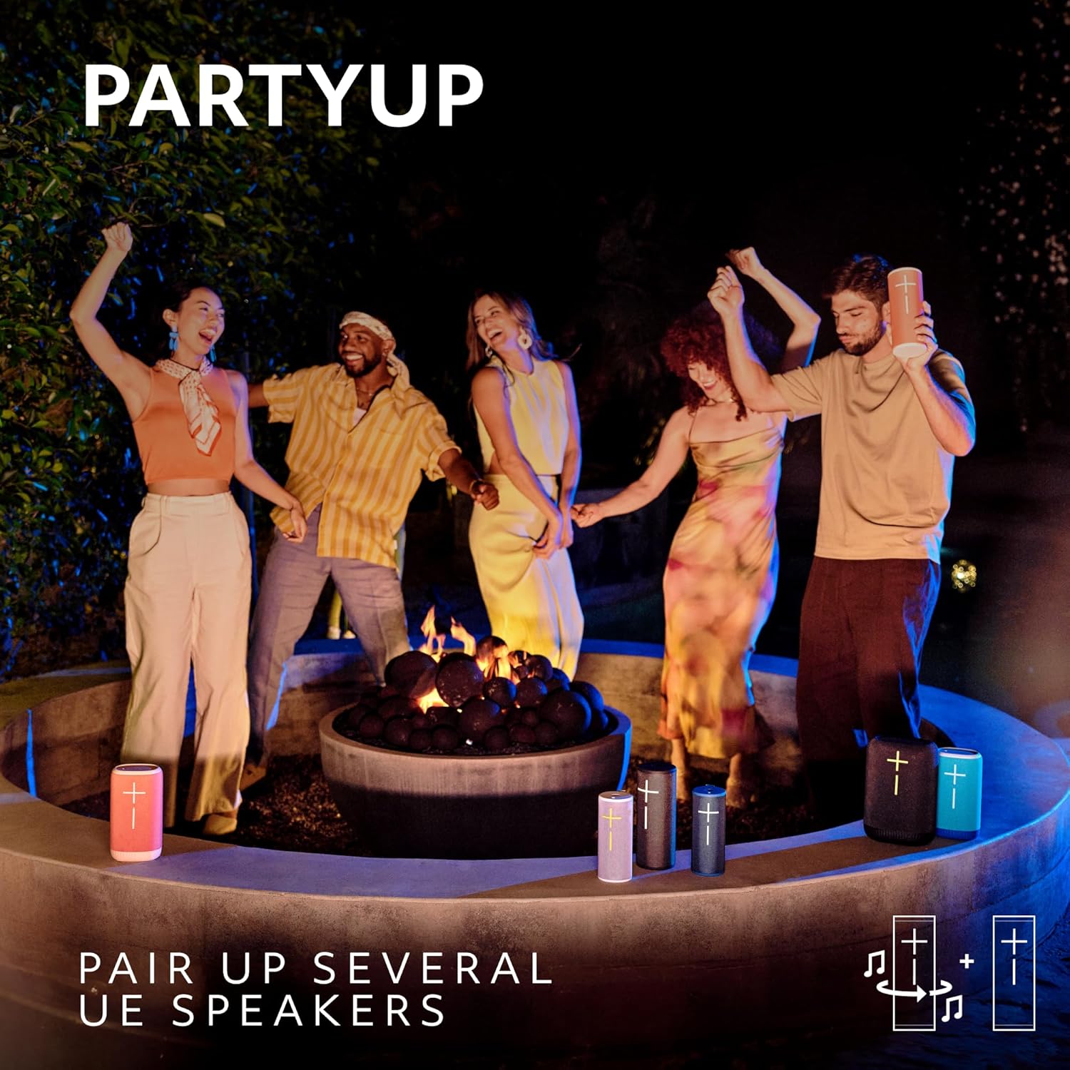 - Party Up: Use PartyUp on the Ultimate Ears Boom app to pair several BOOM, MEGABOOM, EVERBOOM, EPICBOOM, and HYPERBOOM portable Bluetooth speakers to create a surround sound experience with outdoor speakers