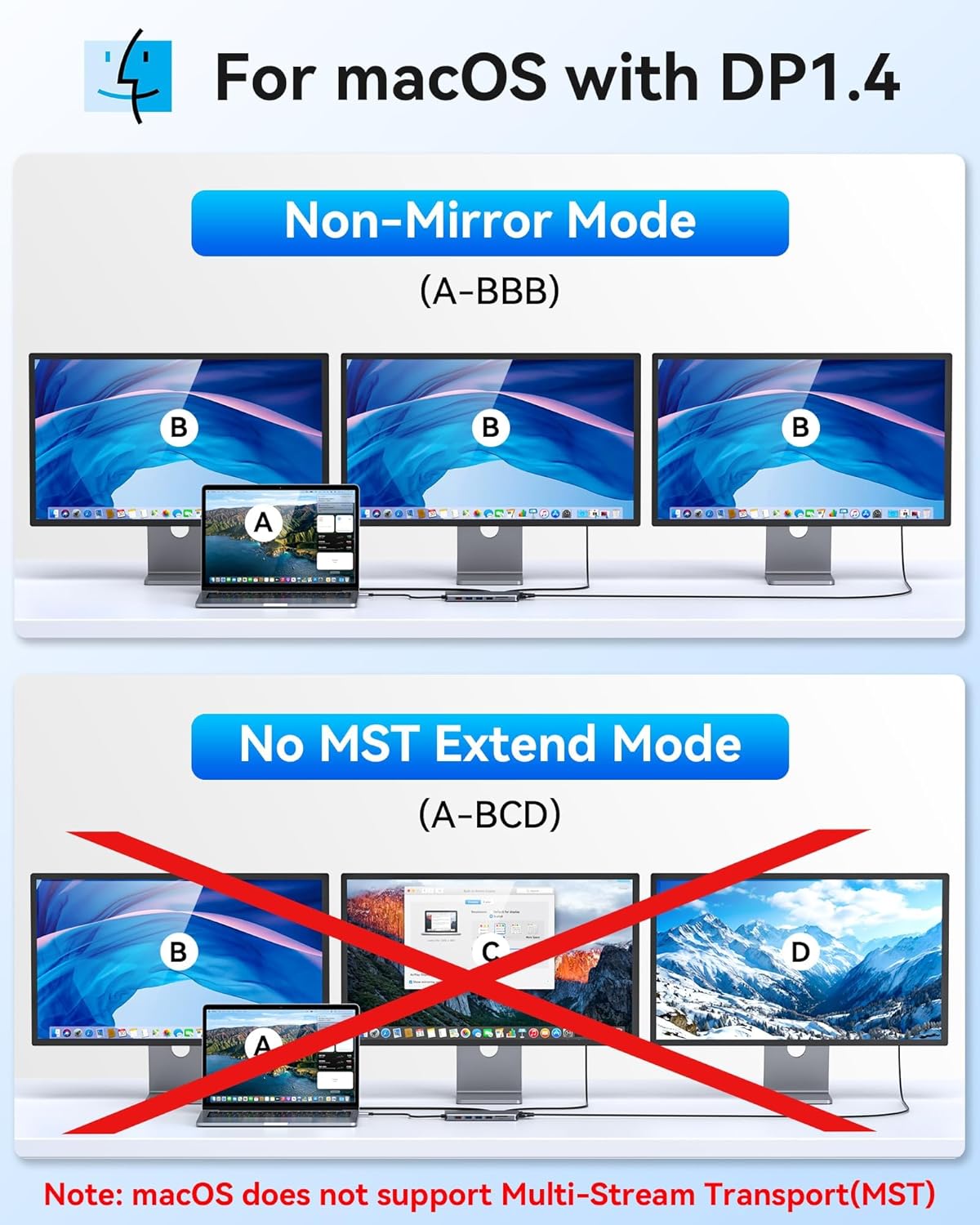 - 【USB C Docking Station Triple Display 】Selore usb c hub hdmi extend 1 usb c port to dual HDMI + VGA. WINDOWS Laptop Support Mirror mode and Extend mode(Display three different screens simultaneously),MAC Support Mirror mode only(M1 and M2 Chip Supports displaying three identical screens).All of the above mode is based on DP1.4 laptop and monitor.Notice: The usb ports do not support transfer display.