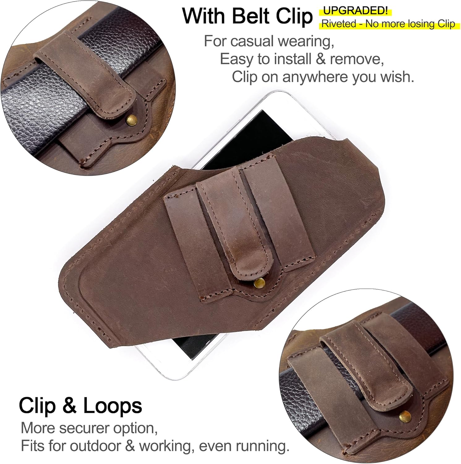 - 【 With Belt Clip 】The belt is no more a necessarily, clip it on anywhere you wish. Easy installation and more convenient, also the double belt loops can be more secure to fix the leather phone pouch on your belt.