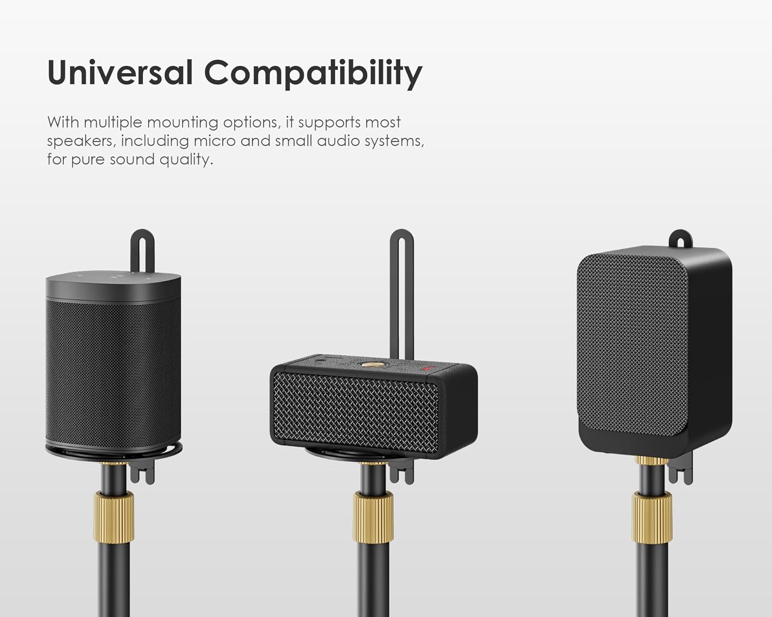 - Universal Compatibility: The rear speaker stands is suitable for various types of small satellite and bookshelf speakers weighing up to 11 lbs, and is compatible with the vast majority of speakers on market. This speaker stand has three installation configurations, including L-shaped bracket, top plate, and clamp fixation, to maximize compatibility with your speaker.