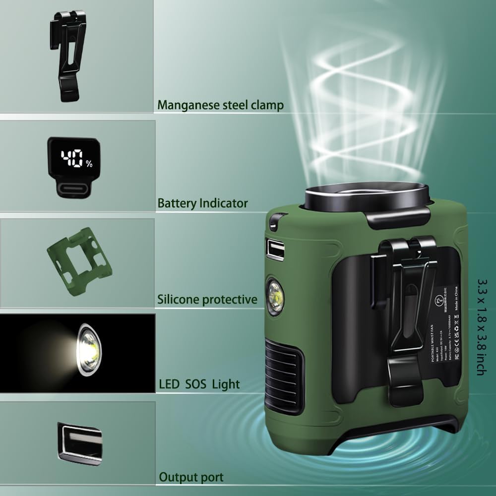 - ăComprehensive Upgrade, Durabilityă: The 2024 upgraded clip-on waist fan is our sixth-generation fan featuring a through-flow fan design. It boasts a more powerful motor, an enhanced silicone protective cover, emergency phone charging capability, and upgraded manganese steel clips. The performance has been improved