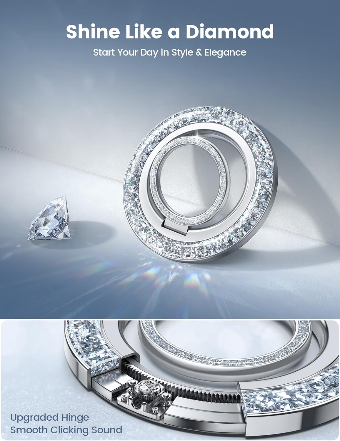 - 2025 Fashion Twinkle Ring : Lamicall 2025 newest magnetic phone ring grip makes a perfect combination of fashion and functionality. Unlike common single-color rings, our newest magnetic phone ring grip is not only a practical cell phone grip stand but also an eye-catching phone ornament. The outer ring of this mag safe grip is adorned with high-quality silver glittering materials, giving it a diamond-like shine that adds a touch of glamour to your mobile phone. A good gift for your wife, daughter, mother, aunt, families, girlfriend, friends, yourself