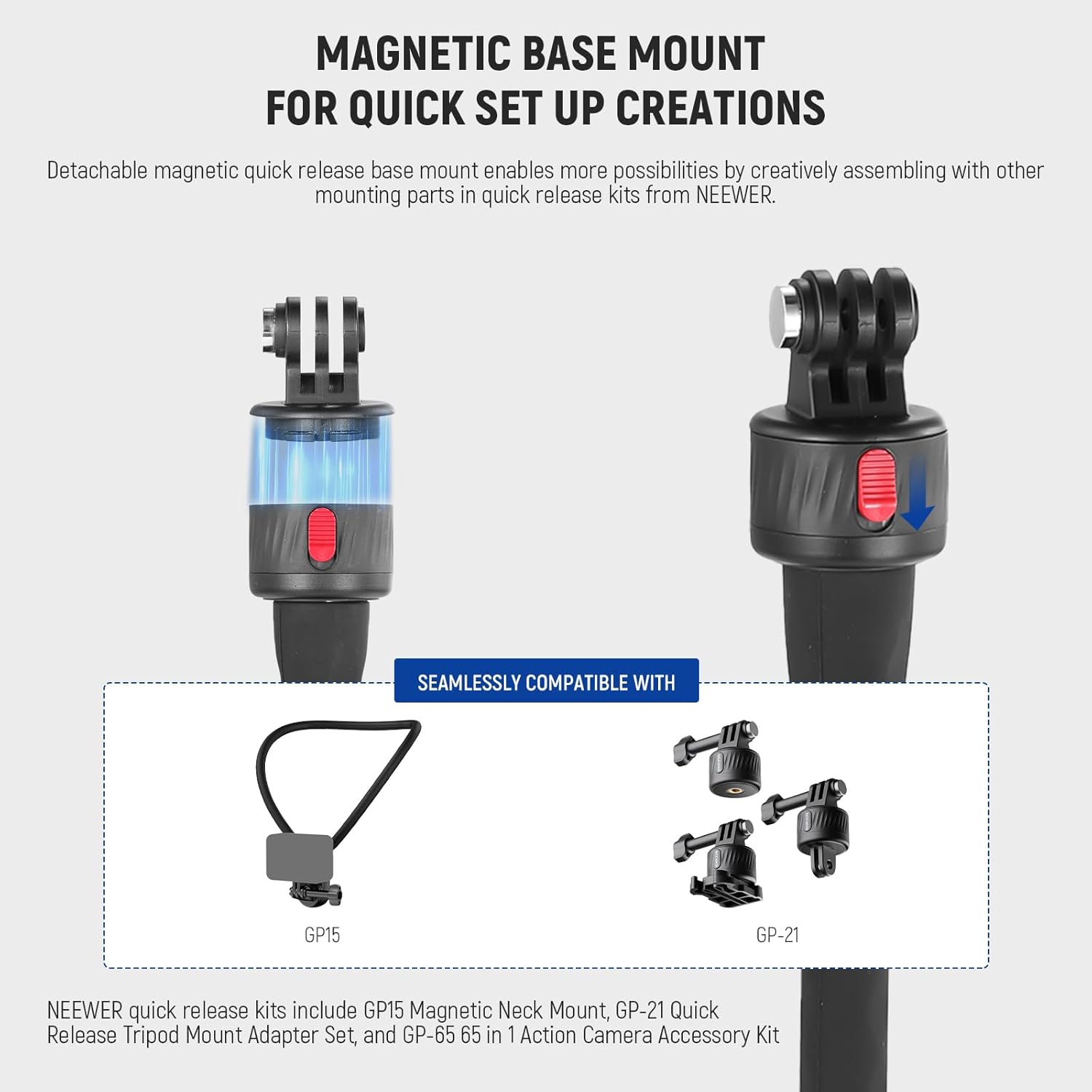 - 【Magnetic Base Mount for Quick Set Up Creations】 The magnetic quick release base mount on the top of the flexible tube is detachable, enabling more possibilities by creatively assembling with the other mounting parts in quick release kits from NEEWER. Including NEEWER GP15 Magnetic Neck Mount, GP-21 Quick Release Tripod Mount Adapter Set, and GP-65 65 in 1 Action Camera Accessory Kit