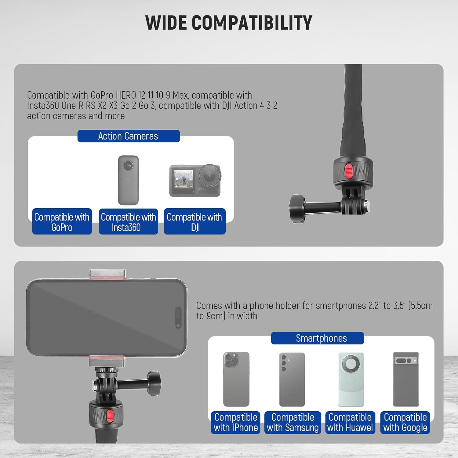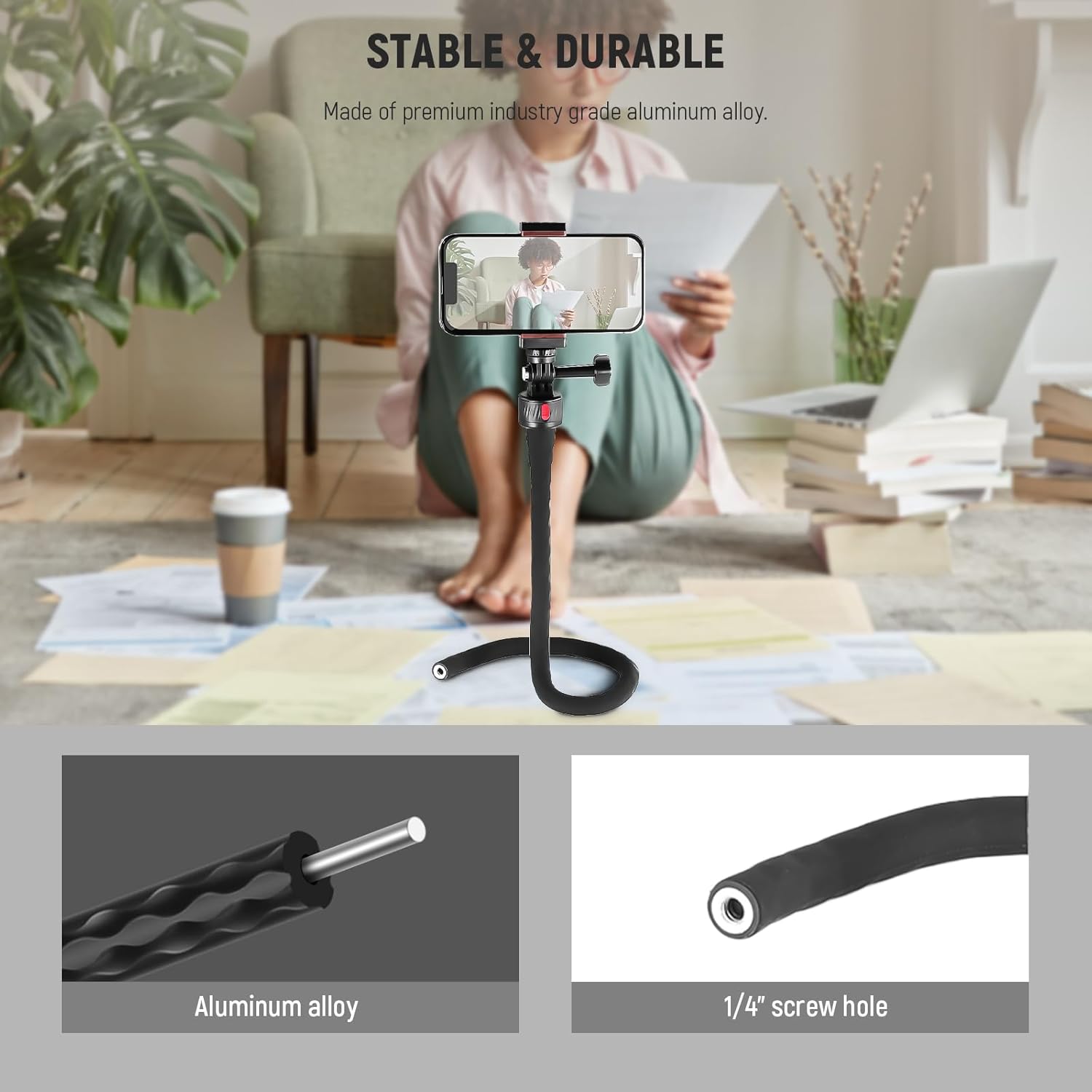 - 【Stable & Durable】 Made of premium industry grade aluminum alloy, this hand free camera mount provides long term service and firmly holds your device up to 10.6oz (300g) while delivering ultra flexibility to bend in any direction as you need