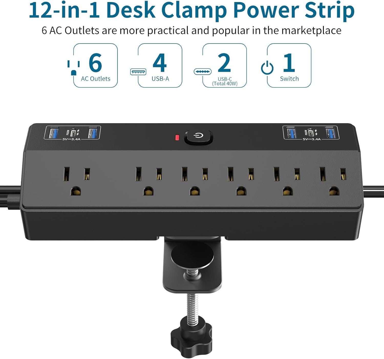 - 【12-in-1 Desk Clamp Power Strip】- Desk clamp power strip office desk accessories combines 6 AC Outlets (1625W 13A) and 4* USB-A ports, 2*PD 20W USB-C ports in a power station . You can charge up to 12 electric devices from this single unit, easily relieve your electricity troubles.