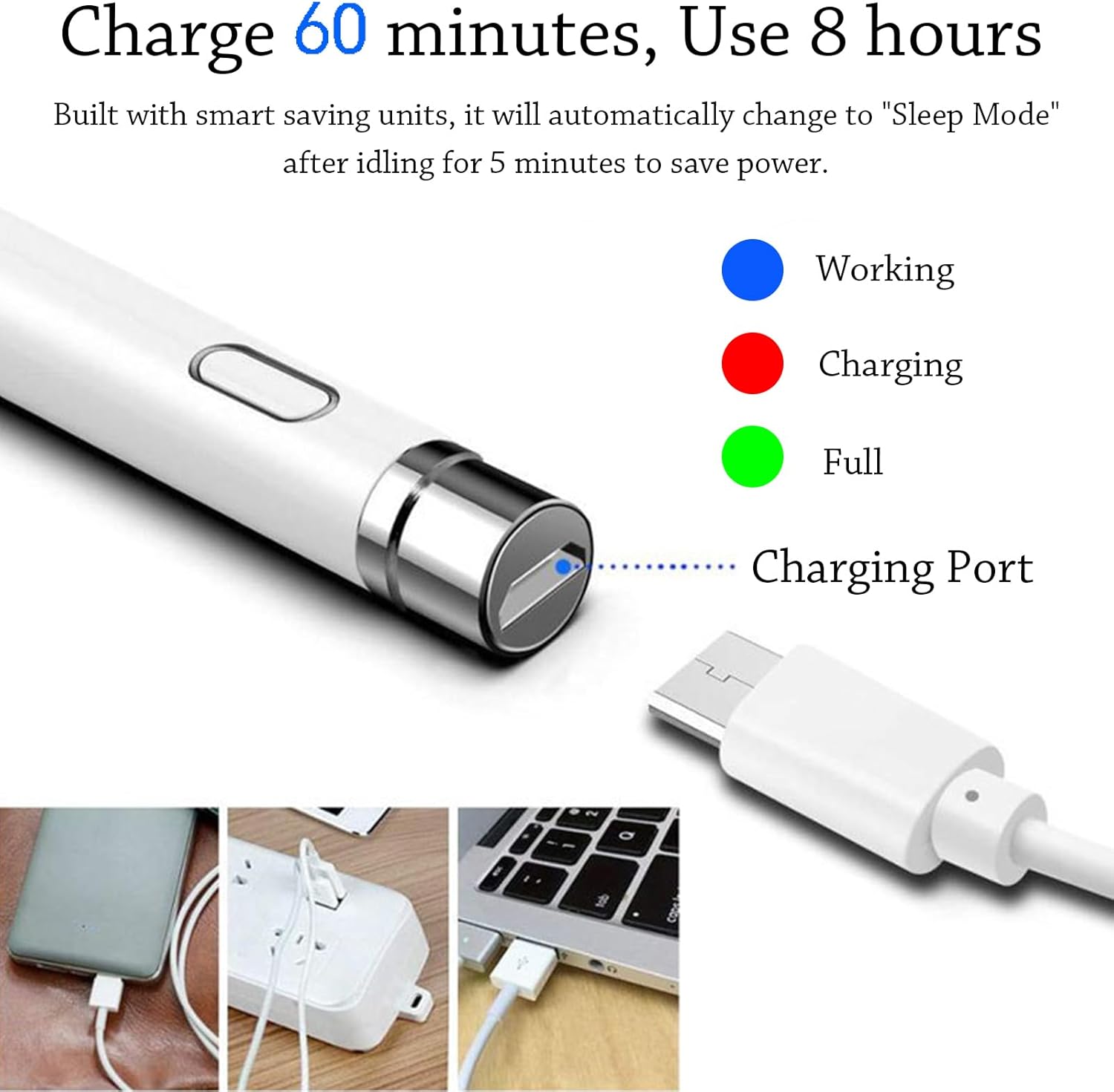 - ăUser-Friendly Designă This tablet ipencil does not need to change pencil tip, it can be used directly after power on. This iphone stylus battery last a long time and doesn't take long to charge. The built-in battery can provide 8-10 hours of use time, and use Micro USB can be fully charged in 60-80 minutes. At the same time the rechargeable pen has intelligent power saving function to protect battery life