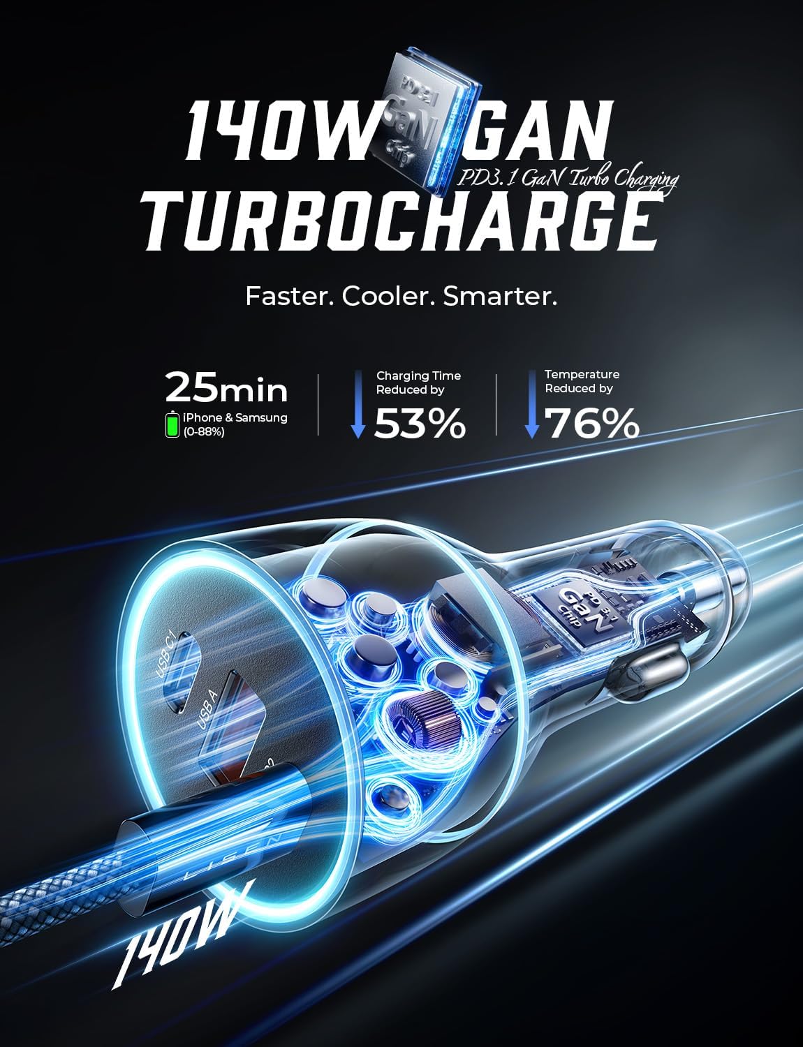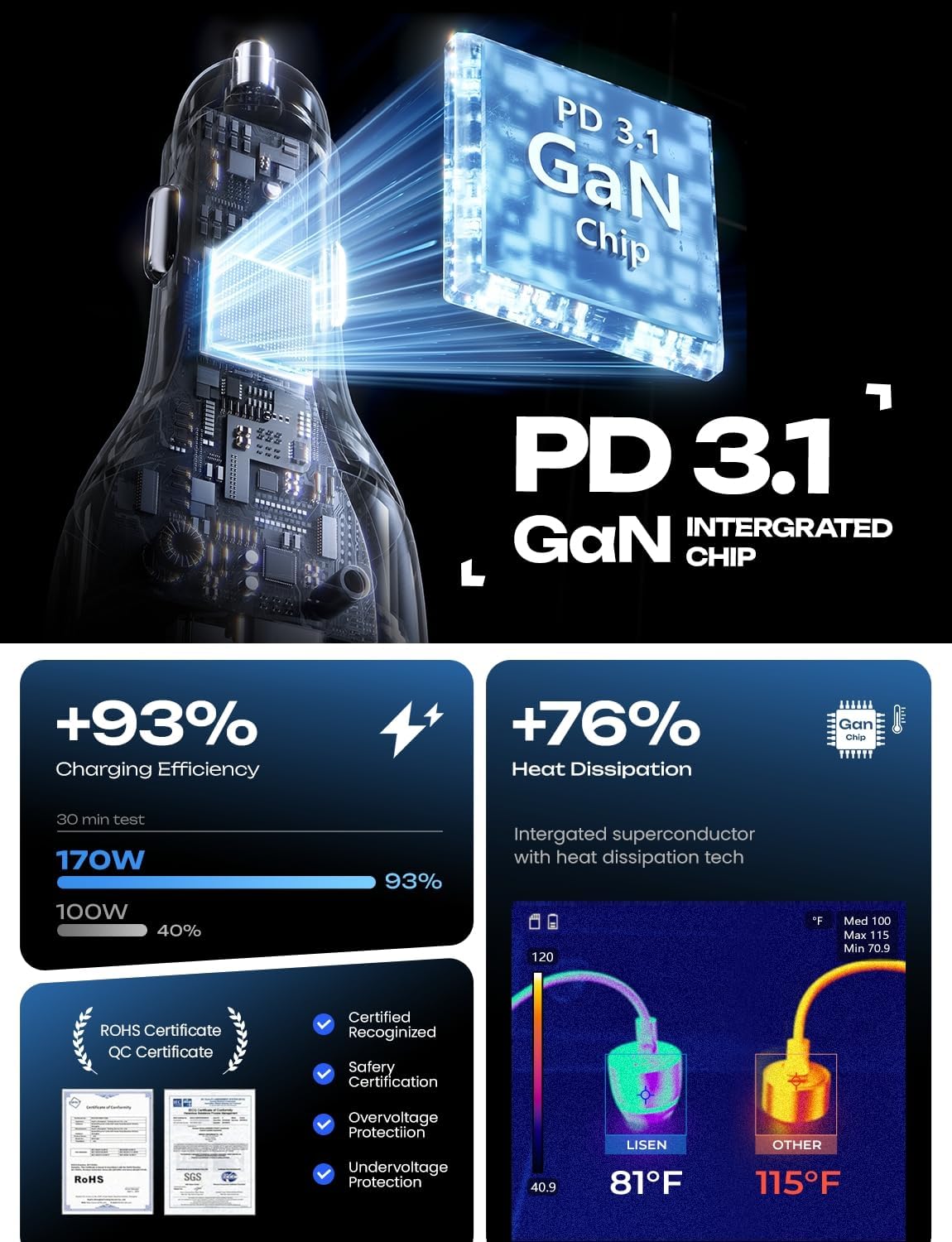 - REVOLUTIONARY GaN TECHBOLOGY: Our latest laptop super fast car charger incorporates GaN technology to double the operating frequency, featuring a stacked design and an enhanced circuit board. This innovation reduces resistance, increases charging efficiency, and ensures safer charging by maintaining optimal temperature control. Recognized by USB-IF, UL tested, RoHS, CE & FCC certified tests, drive easy with protection from over-charge, over-current, over-voltage, over-heating and short-circuit.