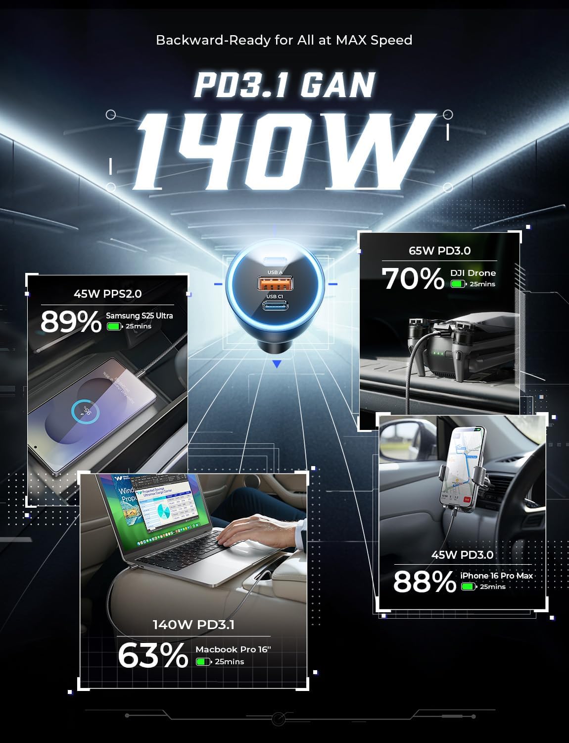 - 170W MUTIPLE FAST CHARGING: Experience the pinnacle of charging technology with the 170W fast charging USB C car charger. Equipped with USB-C2 + USB-C1 ports supporting PD 3.1 & QC 4.0 up to 140W and 30W, and a USB-A port offering QC30W, this fast car charger is fits PD3.1, QC4.0, PPS2.0, and QC3.0 fast charging protocols. Power up three devices simultaneously at once for your laptops, MacBook, iPad, drone, cellphone, iphone 16 pro max plus 15 , Samsung S25 Ultra, optimizing your time on the road with a total output of 170W.