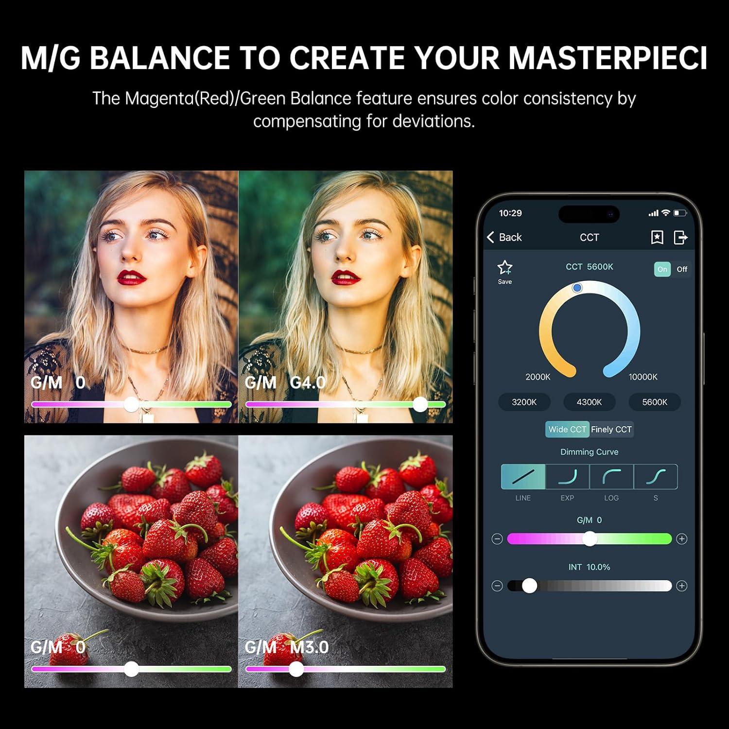 - 【6 Lighting Modes】Full RGB Range, GEL Mode, 16 preset lighting scenes and 12 light source types provide realistic lighting effects for shooting, save a lot of post-production time for special effects work, and improve creative efficiency. CCT Mode: Brightness can be adjusted in 0.1% increments between 0% -100%, and finer dimming accuracy provides smoother dimming. The color temperature range is 2000K - 10000K, and four dimming curves are optional to meet the technical requirements of studio equipment.