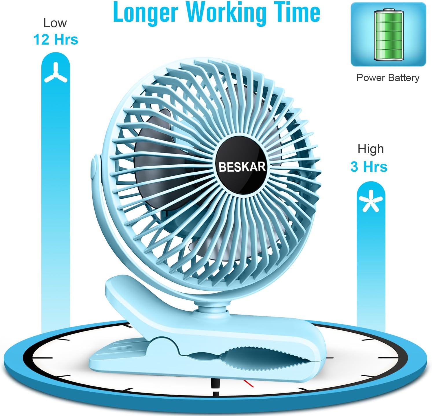 BESKAR Portable Clip on Fan Rechargeable, 4 Speeds Small Battery Operated Fans, USB Desk Fan with Strong Airflow, Sturdy Clamp Fans for Golf Cart Office Outdoor Travel Camping