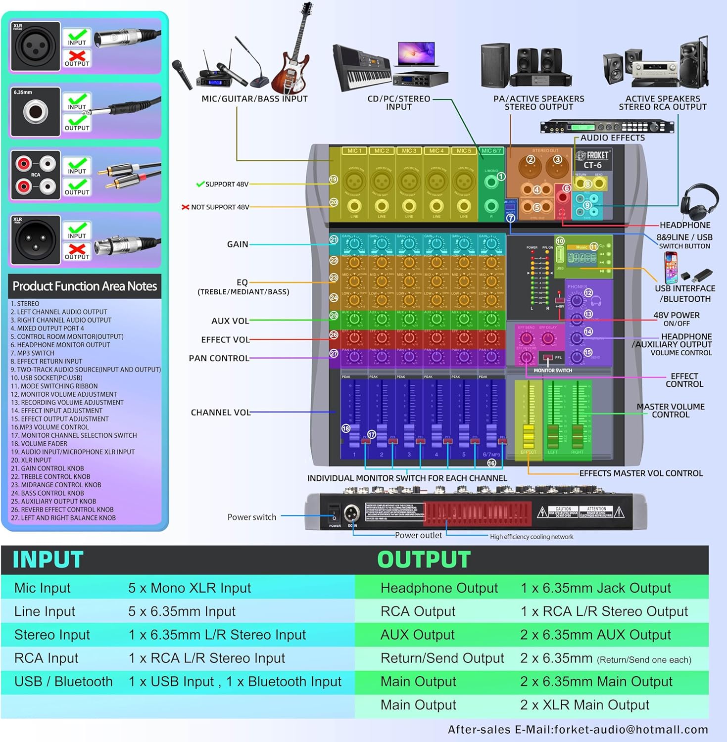 Professional Audio Mixer Sound Board 6 Channel Audio Desk System Interface Digital DJ Console with Bluetooth USB Sound Audio Mixing Console for Karaoke Studio Party Recording Broadcast (CT-6)