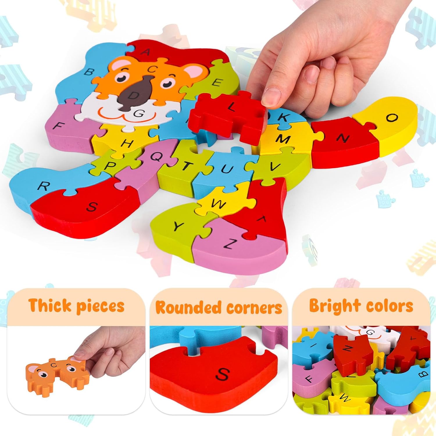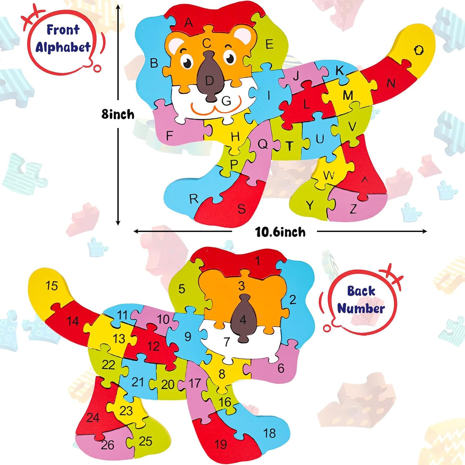 LovesTown Wooden Puzzle Learning Toys Alphabet Number Building Blocks Educational Gift for Preschool Kids Animal Lion Jigsaw 26 PCS