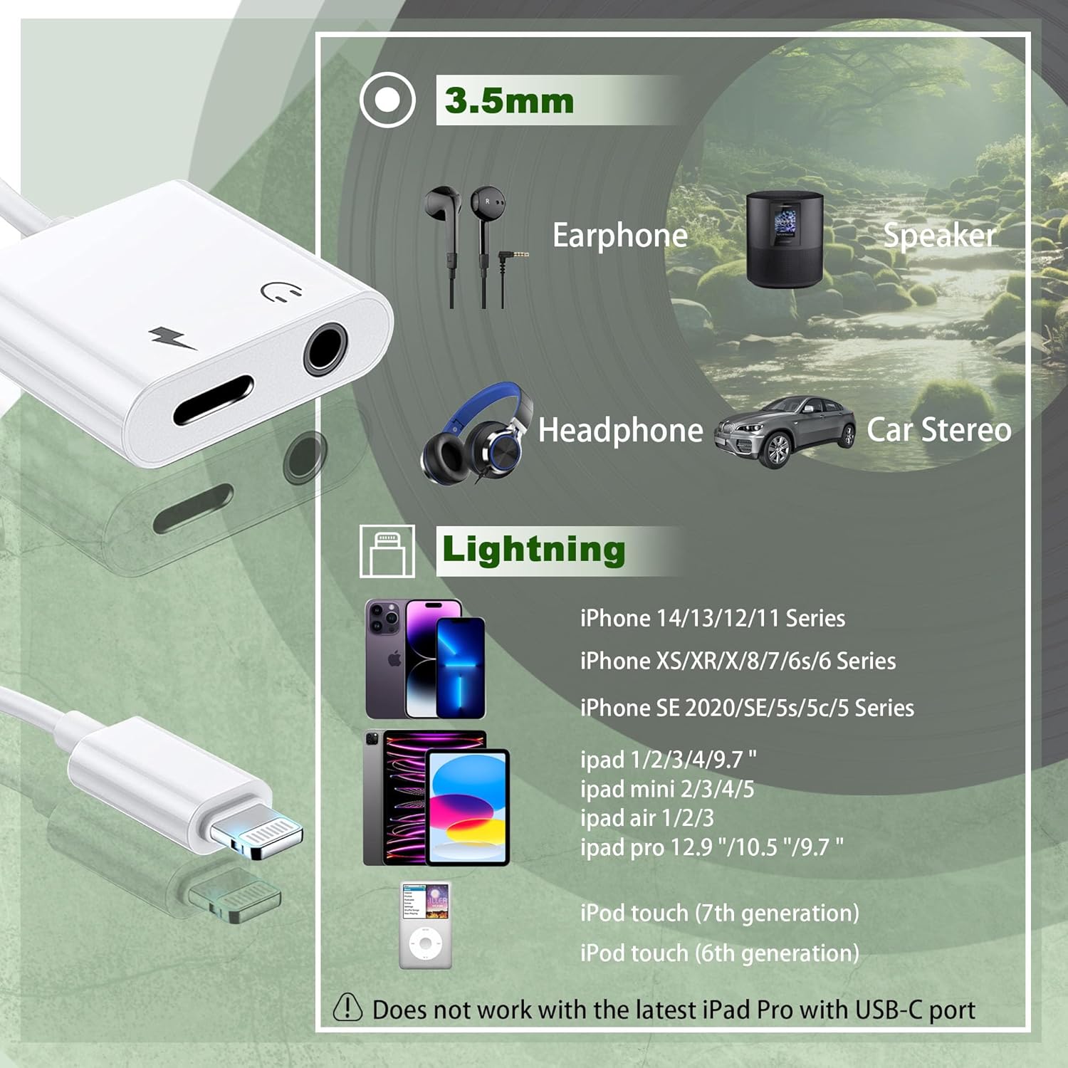 - MULTI-FUNCTIONAL: apple aux adapter not only connects to 3.5mm headphones, but also connects to external audio devices with 3.5mm or car stereo