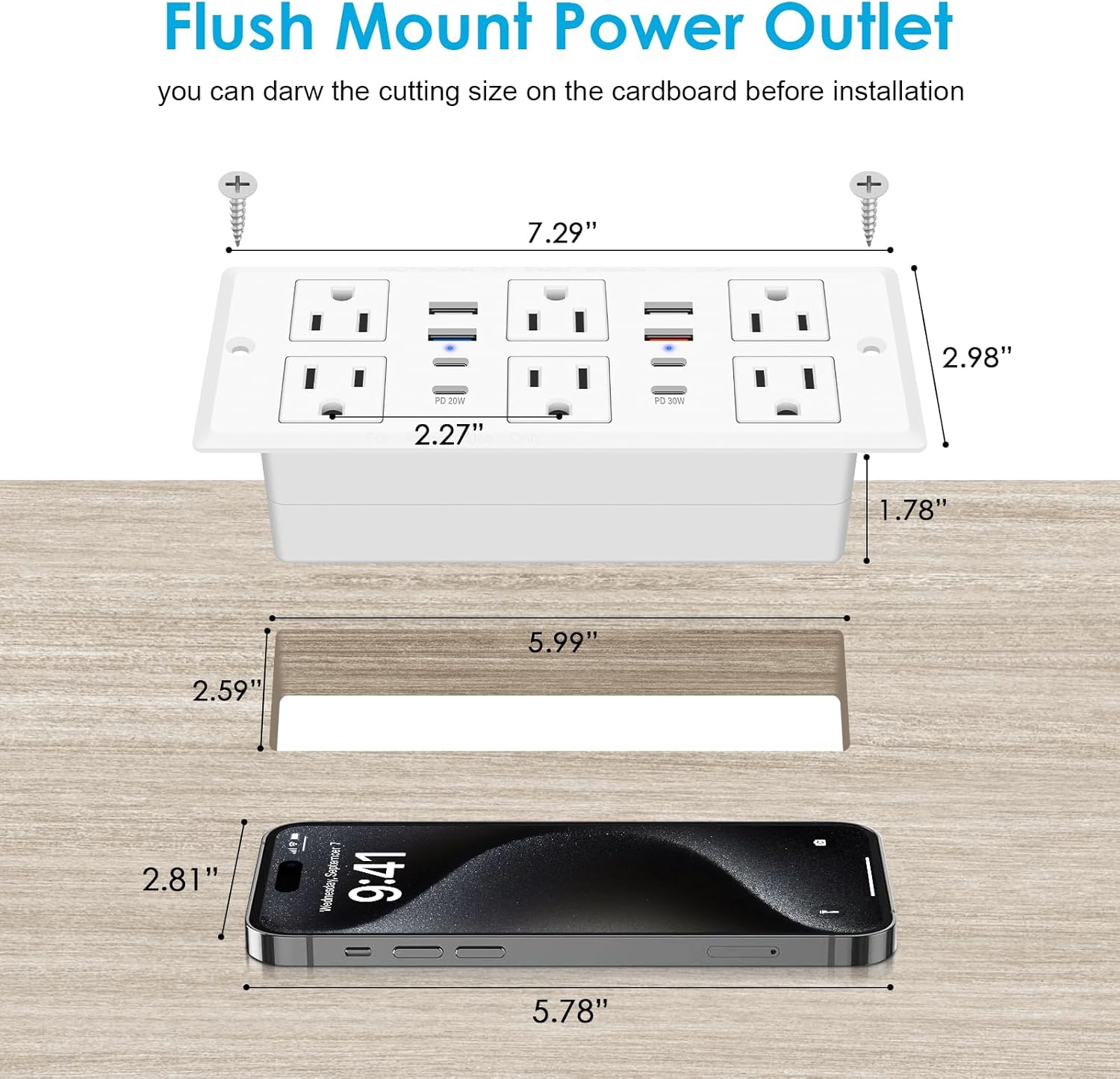 - Dual-Rows Recessed Power Strip White surface plug in 6 AC Outlets & 8 USB Ports (PD 30W and PD 20W).Rich configuration combination is great addition to office, Conference room,furniture narrow table, drawer outlet...