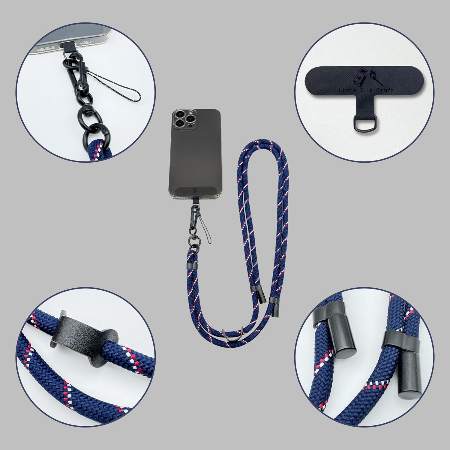 - The package comes with, 1x adjustable phone lanyard, 1x leather buckle, 1x black phone lanyard patch with silver black metal ring, 1x metal lobster clasp, 1x quick release phone tether strap.