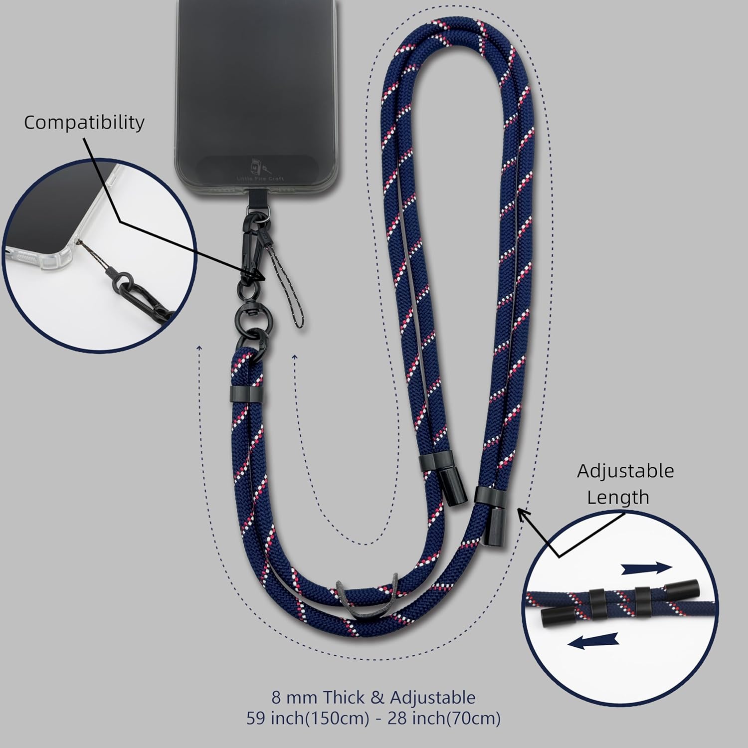 - Features an adjustable cell phone strap from 28 inch (70 cm) to 59 inch (150 cm) that allows you to customize the fit according to your preference. Whether you prefer a snug fit or a looser feel, you can easily adjust the length to suit your comfort level.
