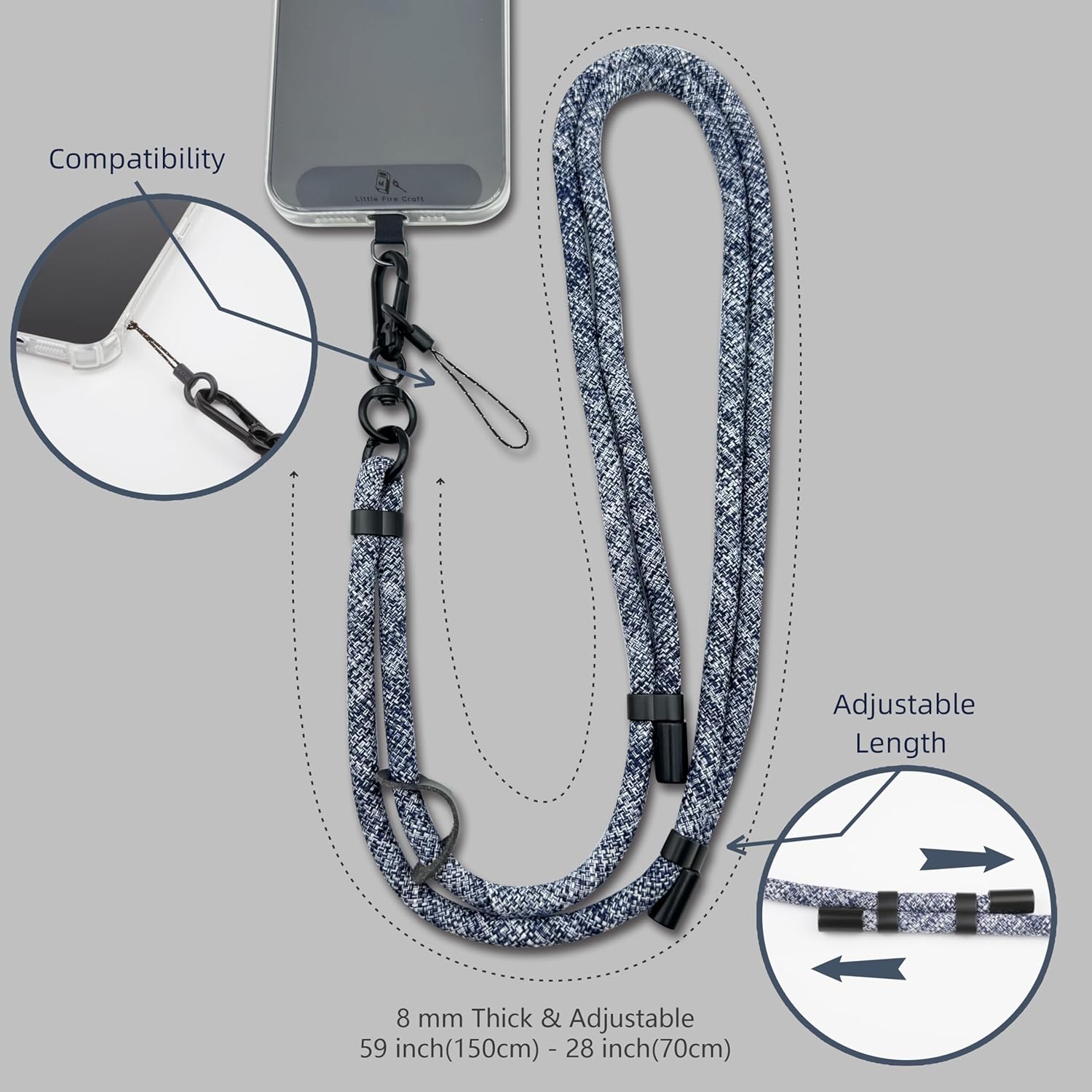 - Our phone lanyard is made of quality soft polyester, the sturdy rope is about 8 mm thick and robust attachment mechanism ensure long-lasting durability.