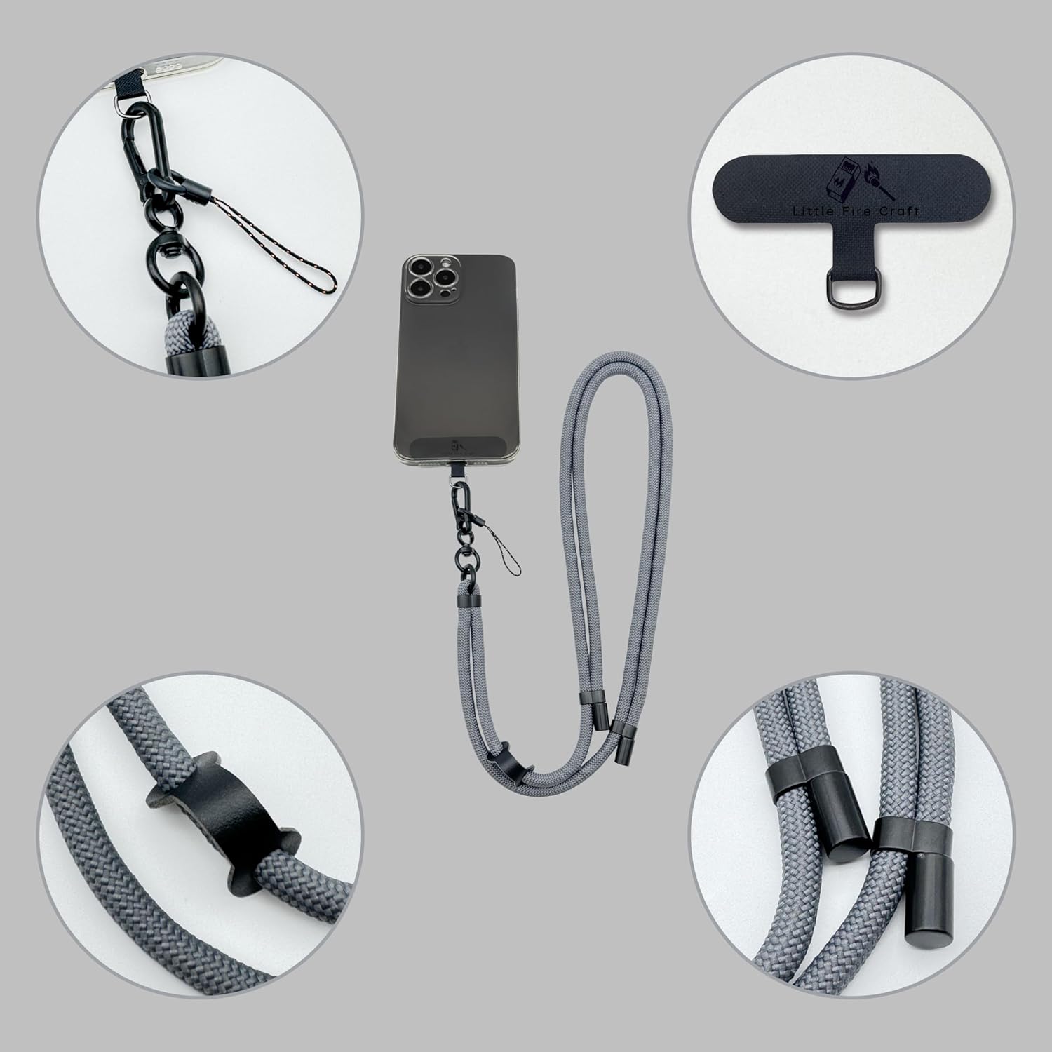 - The package comes with, 1x adjustable phone lanyard, 1x leather buckle, 1x black phone lanyard patch with silver black metal ring, 1x metal lobster clasp, 1x quick release phone tether strap.