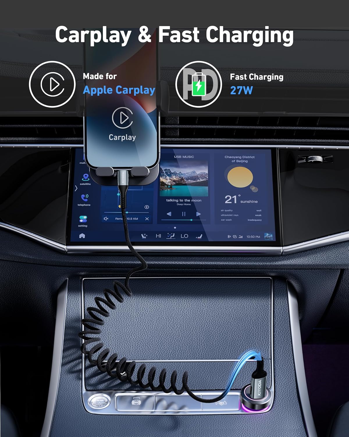 - USB C iPhone Cable Coiled: This coil cable is designed with retractable spring design, no tangle, no knot, not taking up space and easy to carry and use. The automatic rebound design for car charging saves space on the center console and avoids clutter. It is perfectly compatible with CarPlay and charges quickly.