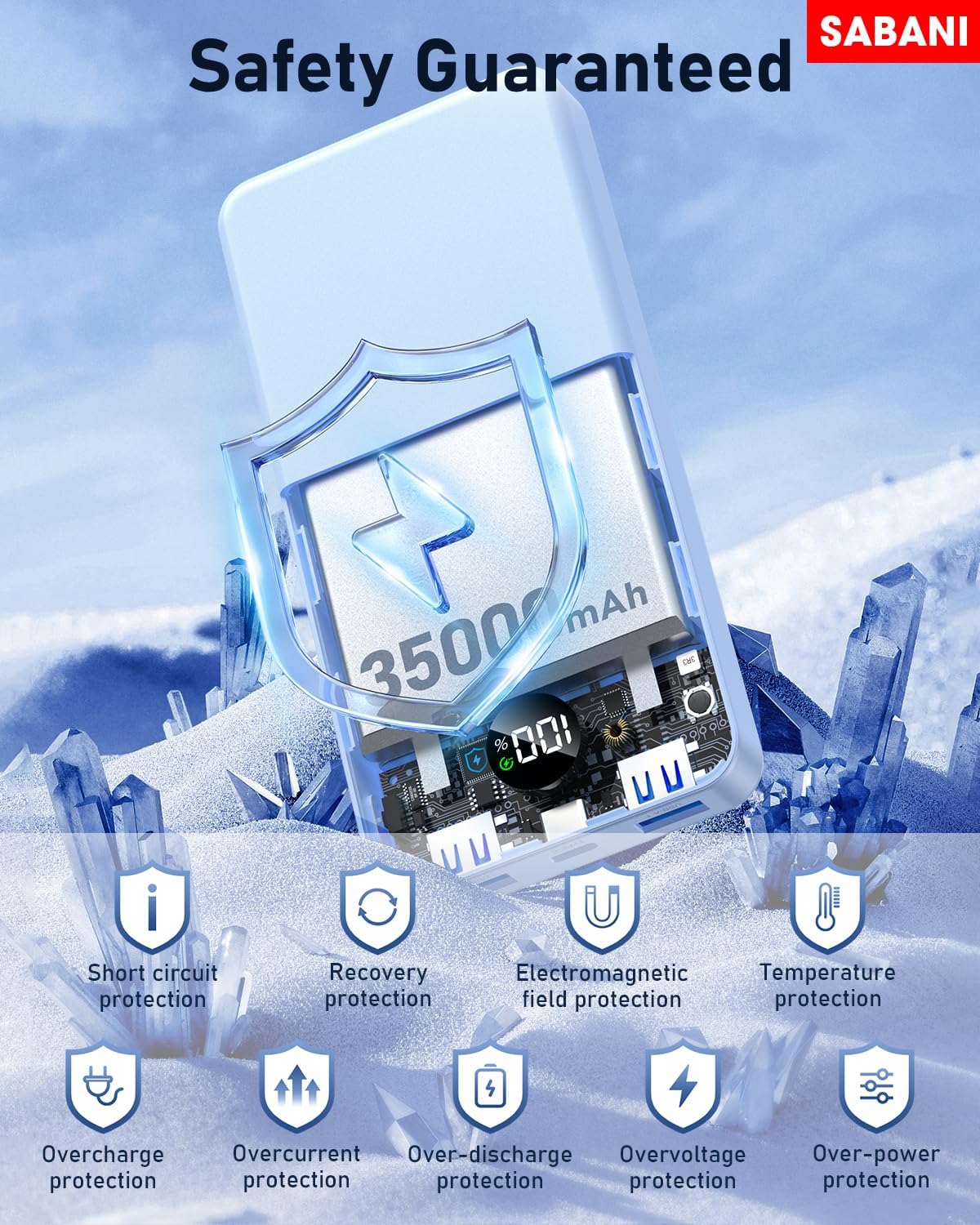 - Safe and Reliable Battery Pack: SABANI portable battery has 10 layers of multiple system protection, built-in low-temperature IC ice core, intelligent monitoring of voltage and current, actively avoid over-charge, over-discharge, short circuit, high temperature and a series of potential dangers, creating a safe charging environment for you. What You Get: 1*35000mAh Portable Charger with 4 built-in Cables and 3 Ports, 1*USB C Cable for Recharging Portable Charger, 1*User Manual.