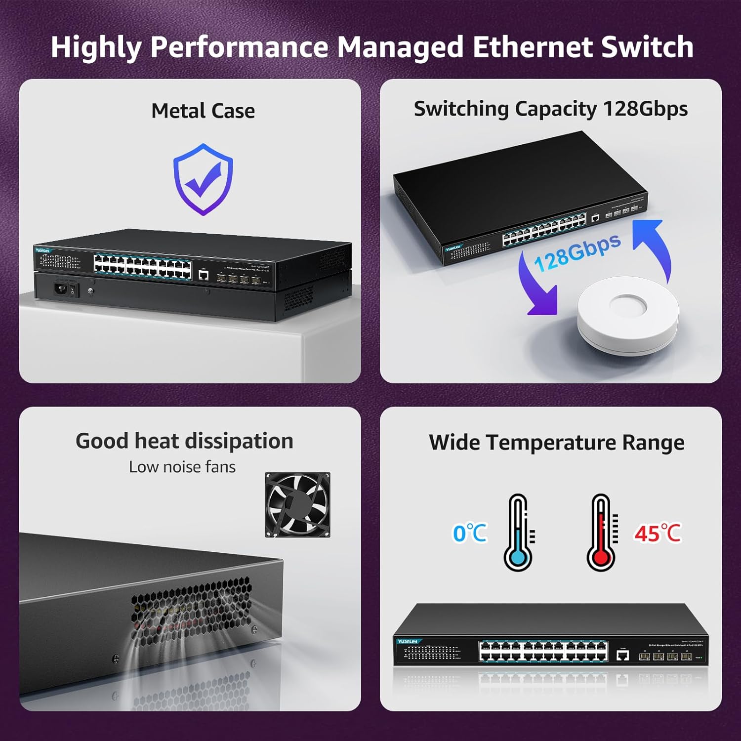 - 【24 Port Gigabit Managed PoE Switch】This network switch from YuanLey is a L3 managed poe switch equipped with 24 Gigabit poe+ ports and 4*10G SFP+ slots. With abundant L3 management features supported, switching capacity 128Gbps, it is capable of delivering high throughput to even the most demanding edge-of-network workgroups, while in small networks it can act as a backbone for Gigabit switches and high-speed servers. 4 SFP+ slots provide greater network flexibility.