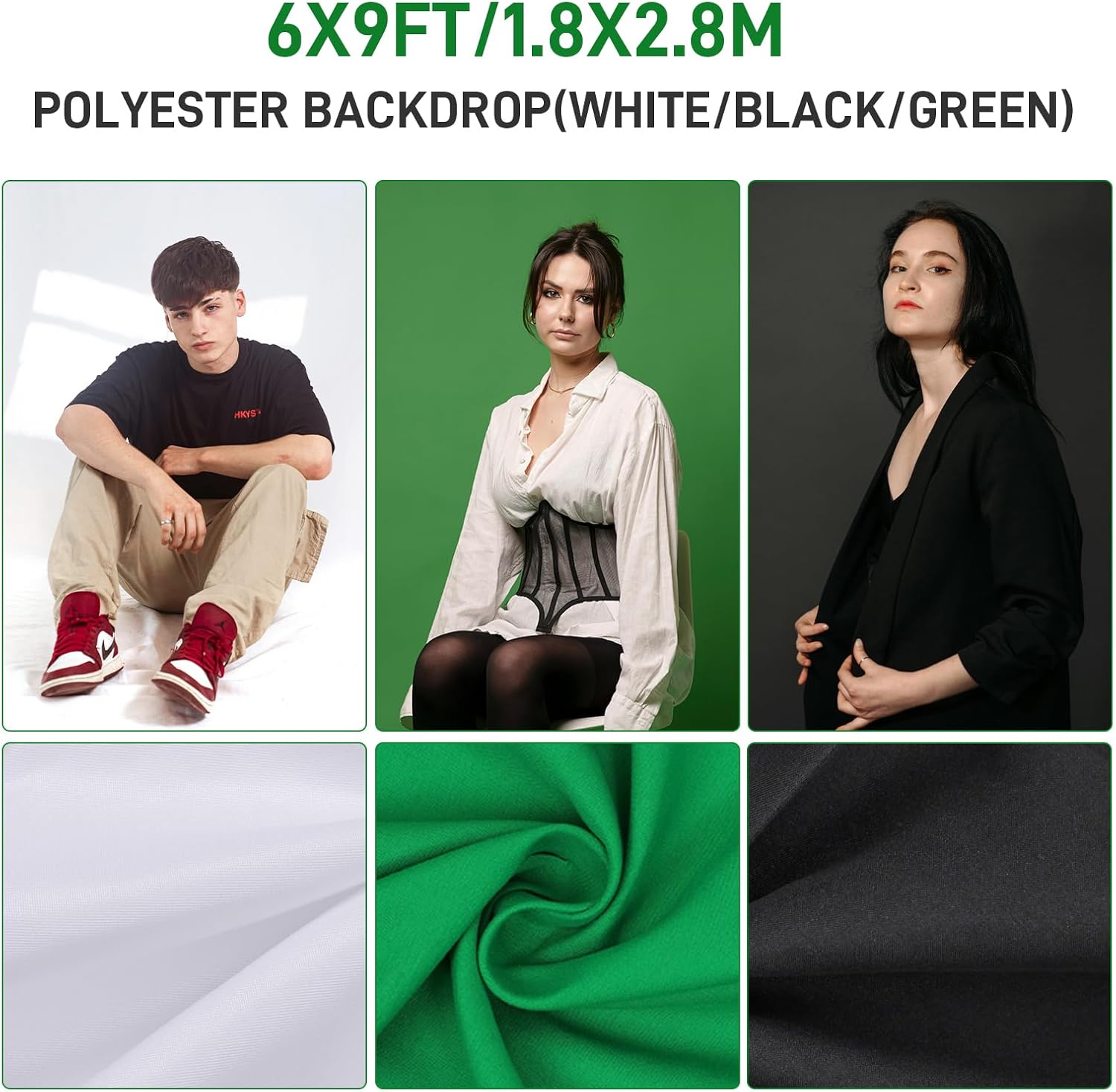 - (1)1.8 x 2.8M/6 x 9 ft Polyester Backdrop(Black,White and Green)+(6)Backdrop Clamps+(1)2.6M x 3M/8.5ft x 10ft Background Support System:The background kit is ideal for television, video production and digital photography.(1)Continuous lighting kit carry case+(1)Background support system carry bag: Great for transporting light stands, umbrellas, and other accessories
