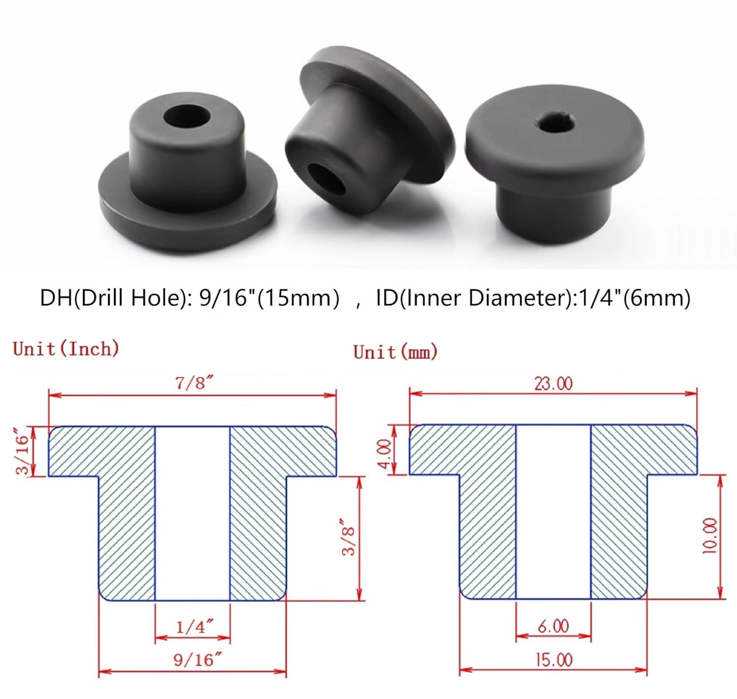 - 【Specification】DH(Drill Hole): 9/16"(15mm),ID(Inner Diameter):1/4"(6mm), the product drawings are represented in "mm" and "inch";