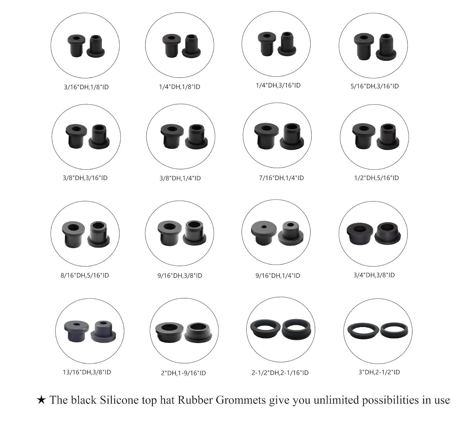 - 【Application】The environmentally friendly black silicone rubber grommet has some good elasticity, sealing and waterproofing properties, and can be used to protect pipelines, wires and cables from scratches and damage,and widely used in Automotive, Firewall, Hole plug ,Wiring, Wire, Screw ,Desk hole, Gas pipe , Water pipe, House siding, Drain, Glass, Cable bushing, Wire plug, Wood hole, Plywood, Tub parts, Marine wire, Plastic tubing, Temp probe, Plastic cable, Metal panels, Electrical appliance, Spray, cylinder,Hydroponic, Irrigation and so on;