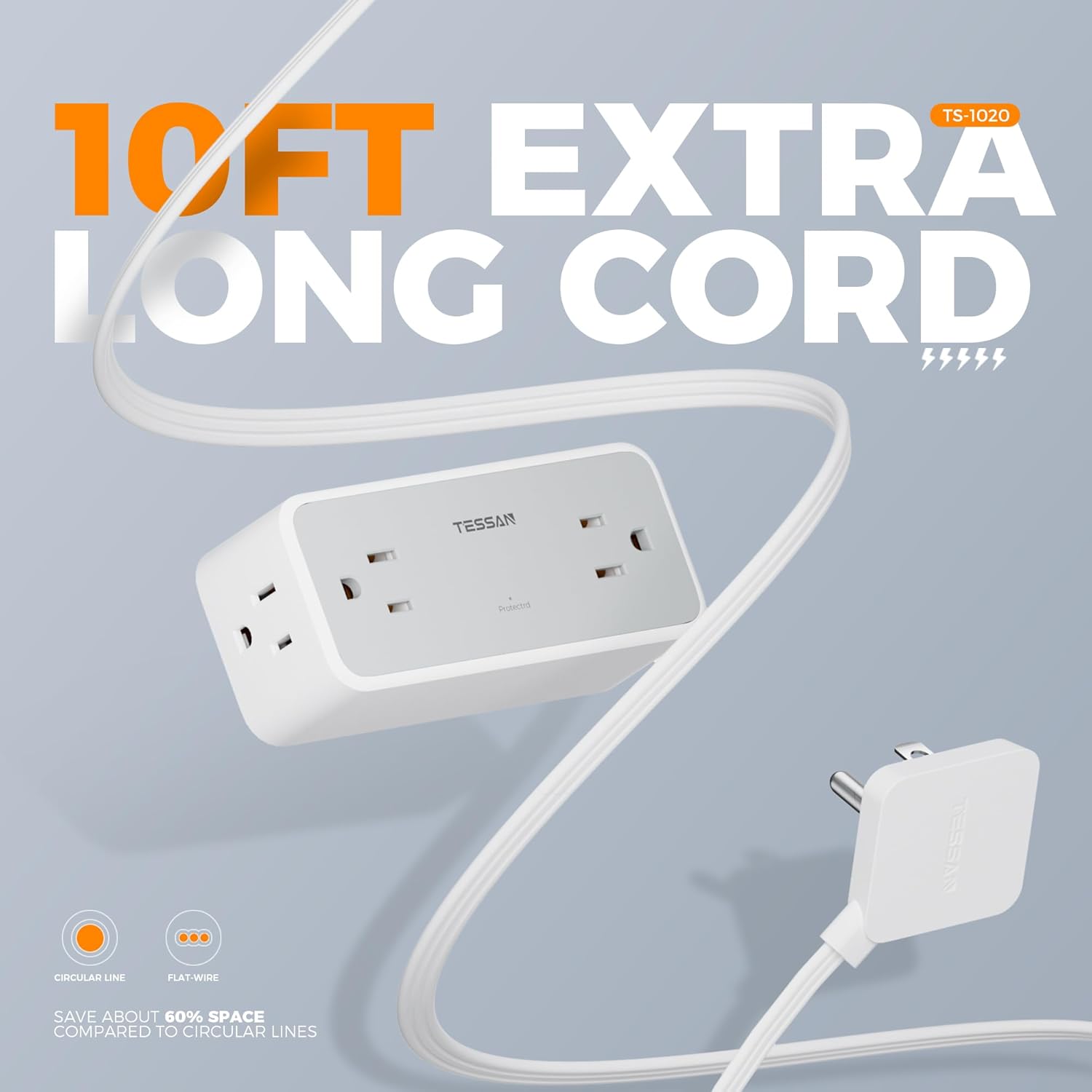 - Flat Plug Power Strip: With only 0.31 in ultra thin flat head design, 10 foot power strip long cord can easily fit in tight spots and hide behind sofa, bed or other furniture, sitting flush against the wall, keeping your house very clean and tidy; 45 degrees right angle design creates an extra space for other plug without any blocking