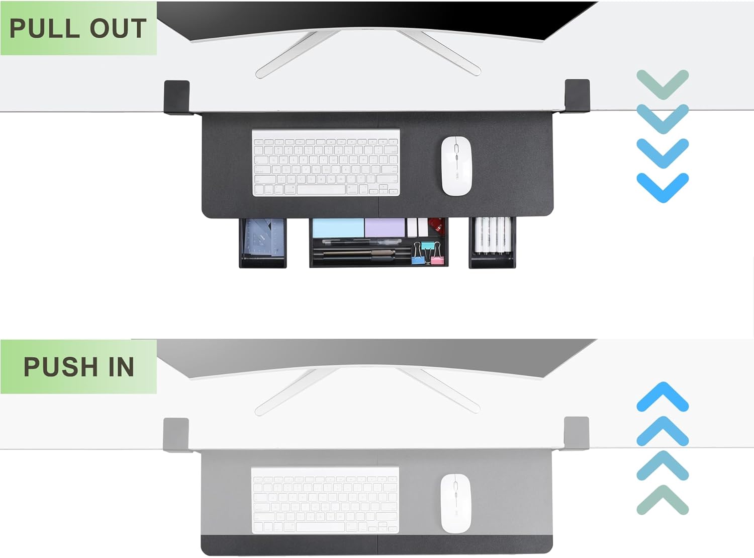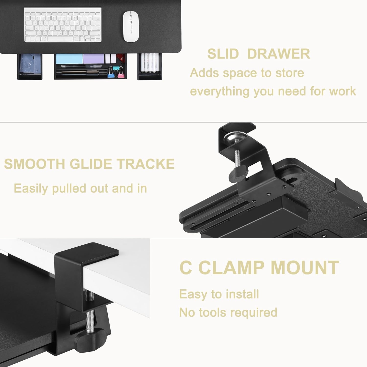 - Space-saving Design: Free up valuable desktop space by conveniently mounting your keyboard underneath your desk, keeping your work area tidy and organized.Transform your workspace with our Keyboard Tray Under Desk and experience improved comfort, efficiency, and organization in your daily tasks.
