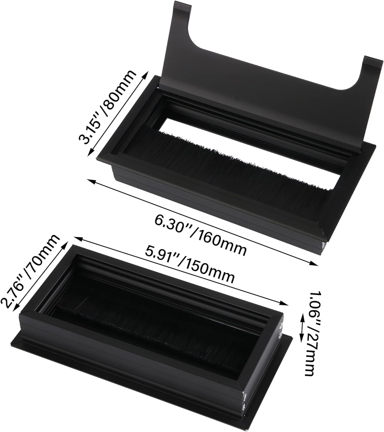 2PCS Desk Grommet Metal Rectangle Desk Cord Cable Hole Cover Grommet with Brush for Home Office Bank Computer Table (black)