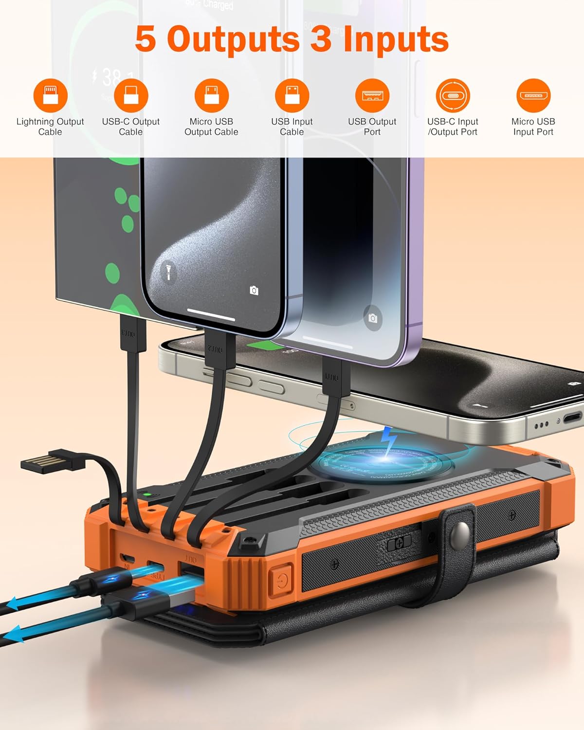 - Built-in Cables for Multi-Device Compatibility : Say goodbye to the hassle of carrying multiple charging cables. The solar charger comes equipped with four built-in output cables. Featuring multiple ports, it can power up to five devices simultaneously