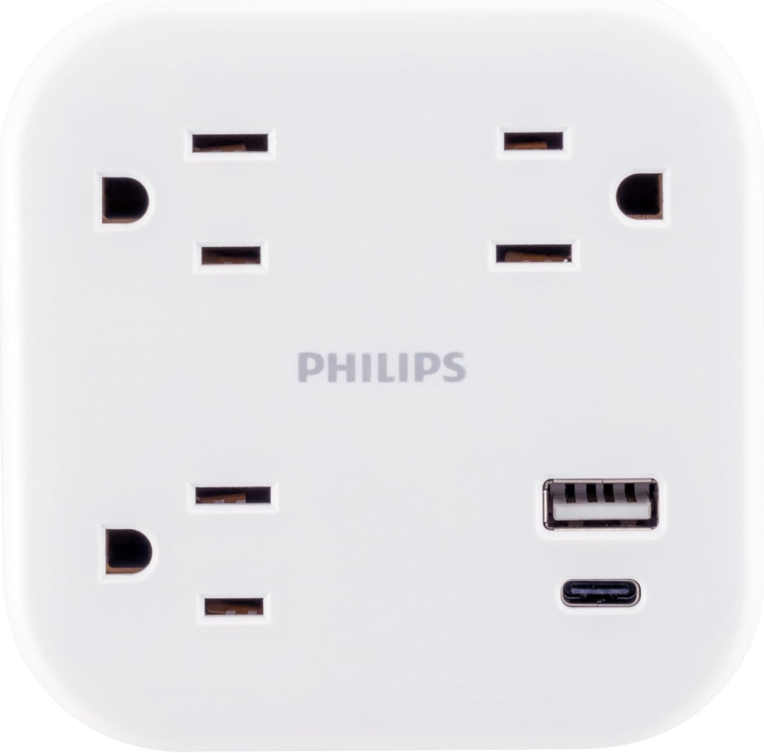 Philips EZFit 3-Outlet Surge Outlet Extender with USB, 1 USB-A, 1 USB-C, Adapter Spaced, Charging Station, 12W, 980 Joules, White - SPP9393W/37
