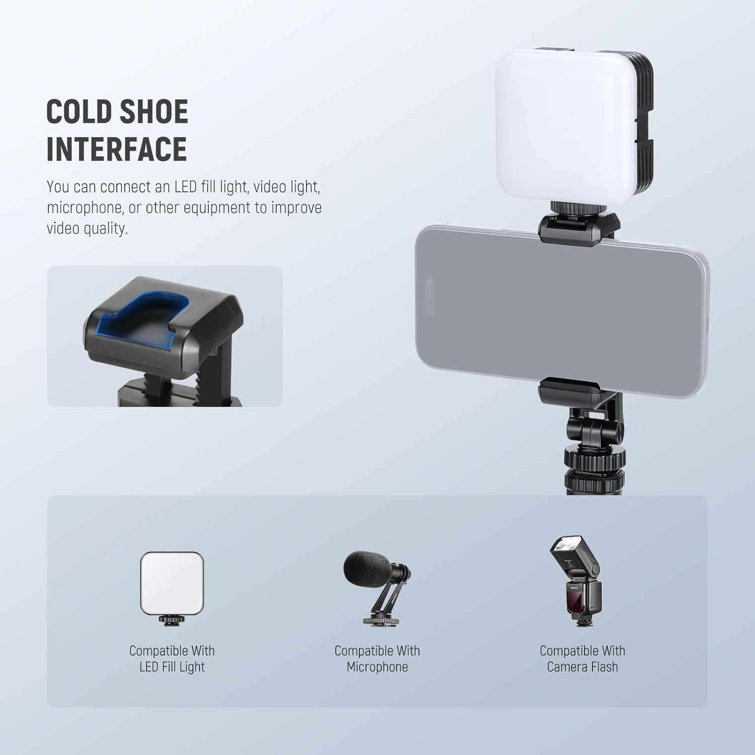 - 【Universal Cold Shoe Mount】 The bottom of a cold shoe mount allows you to attach a camera, so you can preview and monitor real time shooting footage on your phone with this camera phone mount. Or you can attach an LED fill light, video light, microphone, or other equipment to improve your video quality