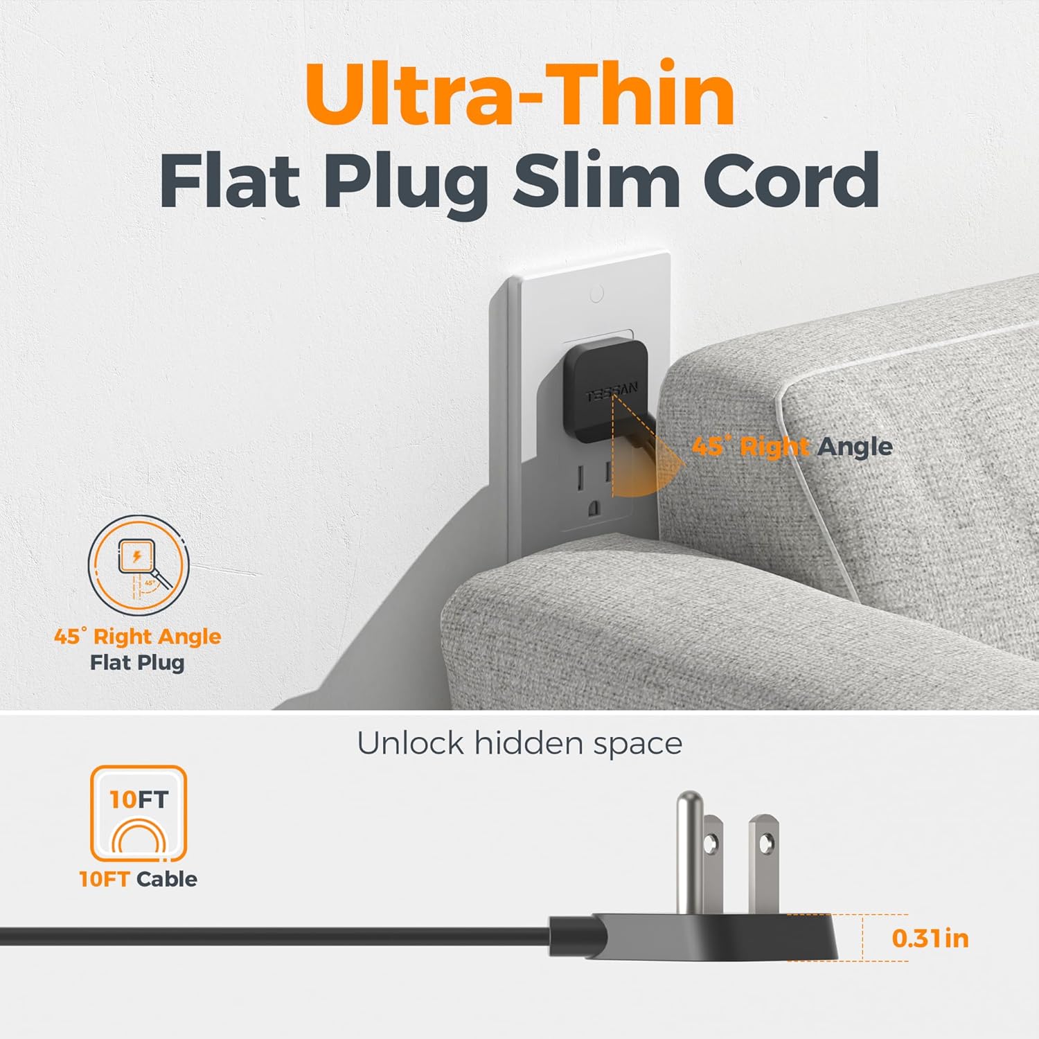 - 10 Ft Desk Extension Cord: Flat plug power strip 10 Ft cord offers flexibility to reach distant outlets and hard to reach places indoor; 45 degrees right angle and 0.31 inch ultra thin flat head design creates an extra space for other plug below without blocking