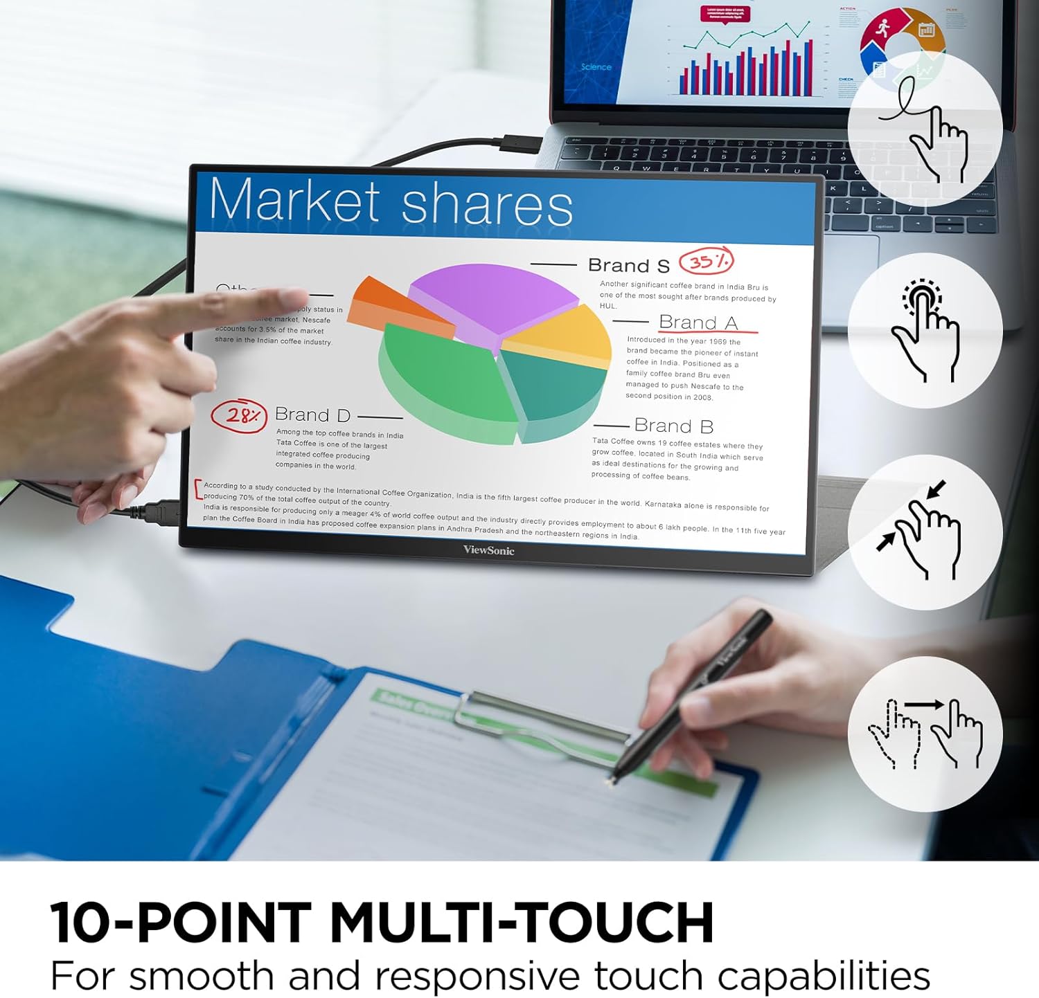 ViewSonic TD1656-2K 16 Inch WQXGA 1600p IPS Touchscreen Portable Monitor with 2 Way Powered 65W USB C, and Smart Cover with Built-in Stand