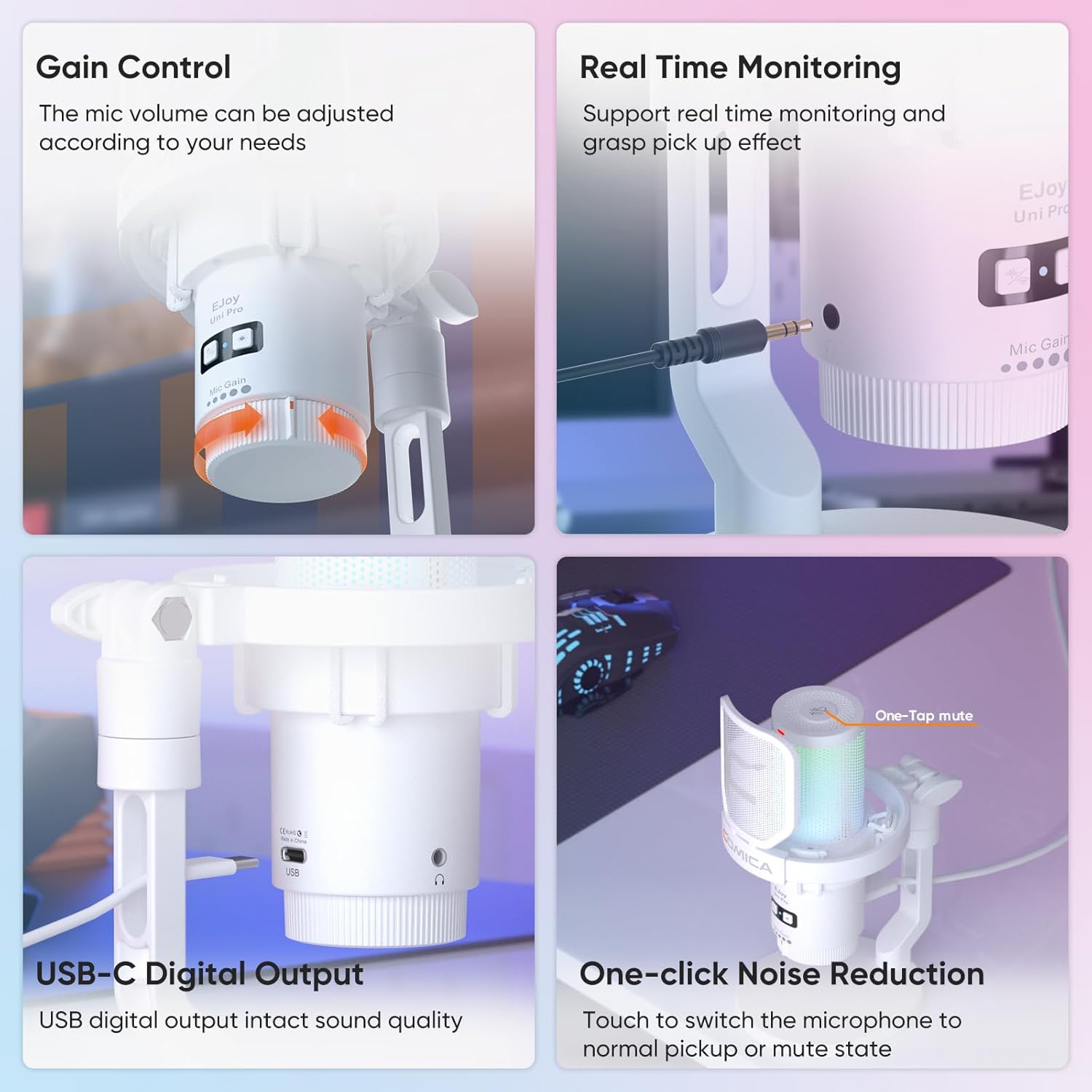 - ăControllable Dynamic Radiant RGB Lighting with 3 Unique RGB Effectsă Ejoy Uni Pro wireless gaming microphone features dynamic RGB lighting effects including breathing light, dynamic gradient, and audio dynamics, adding visual appeal to your gaming and live broadcasts to attract more viewers.